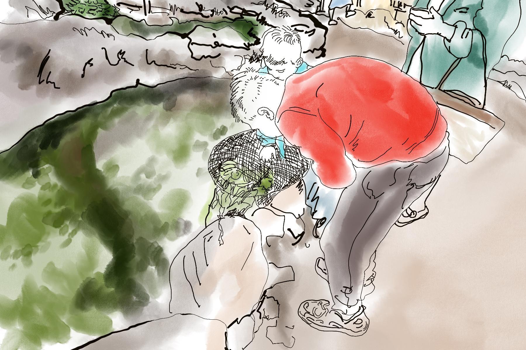 傍晚刚放学的两个小男孩,哥哥正在教弟弟捕鱼,一大一小互相协作,成功在公园的池塘里捉到一条活蹦乱跳的小鱼。两个小朋友开心地哇哇乱叫,为了这来之不易的成果欢呼呐喊着。
