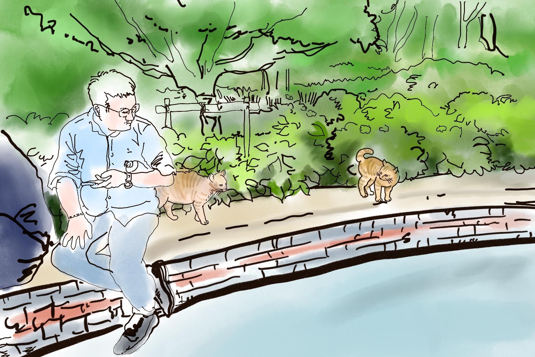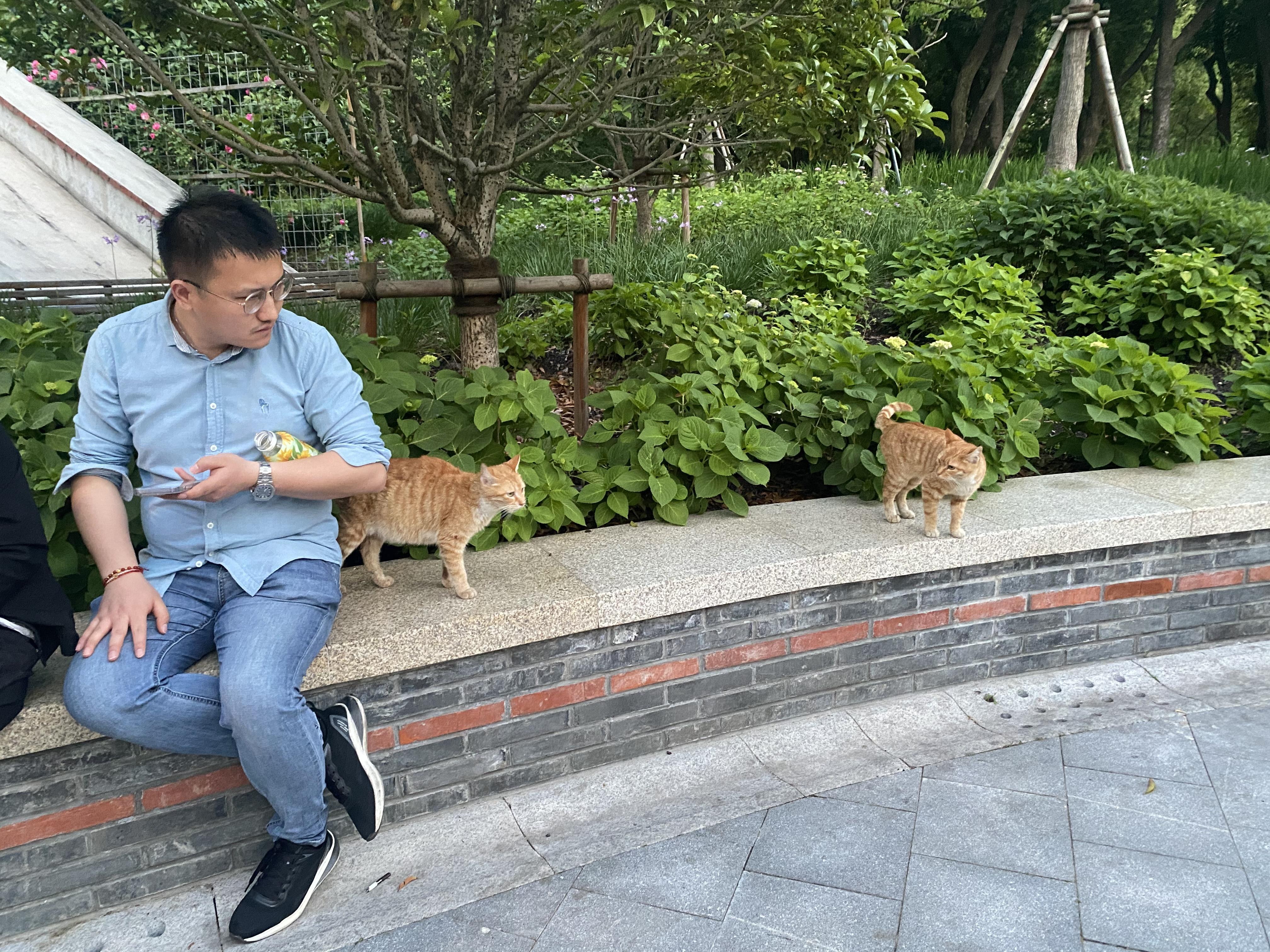 傍晚在湖滨道公园的小草坪小憩一番的白领,背后的树丛窜出的两只小黄猫好奇地打量着坐着的人类。大家相安无事,彼此和谐美好的这一幕也是岁月静好的一部分。