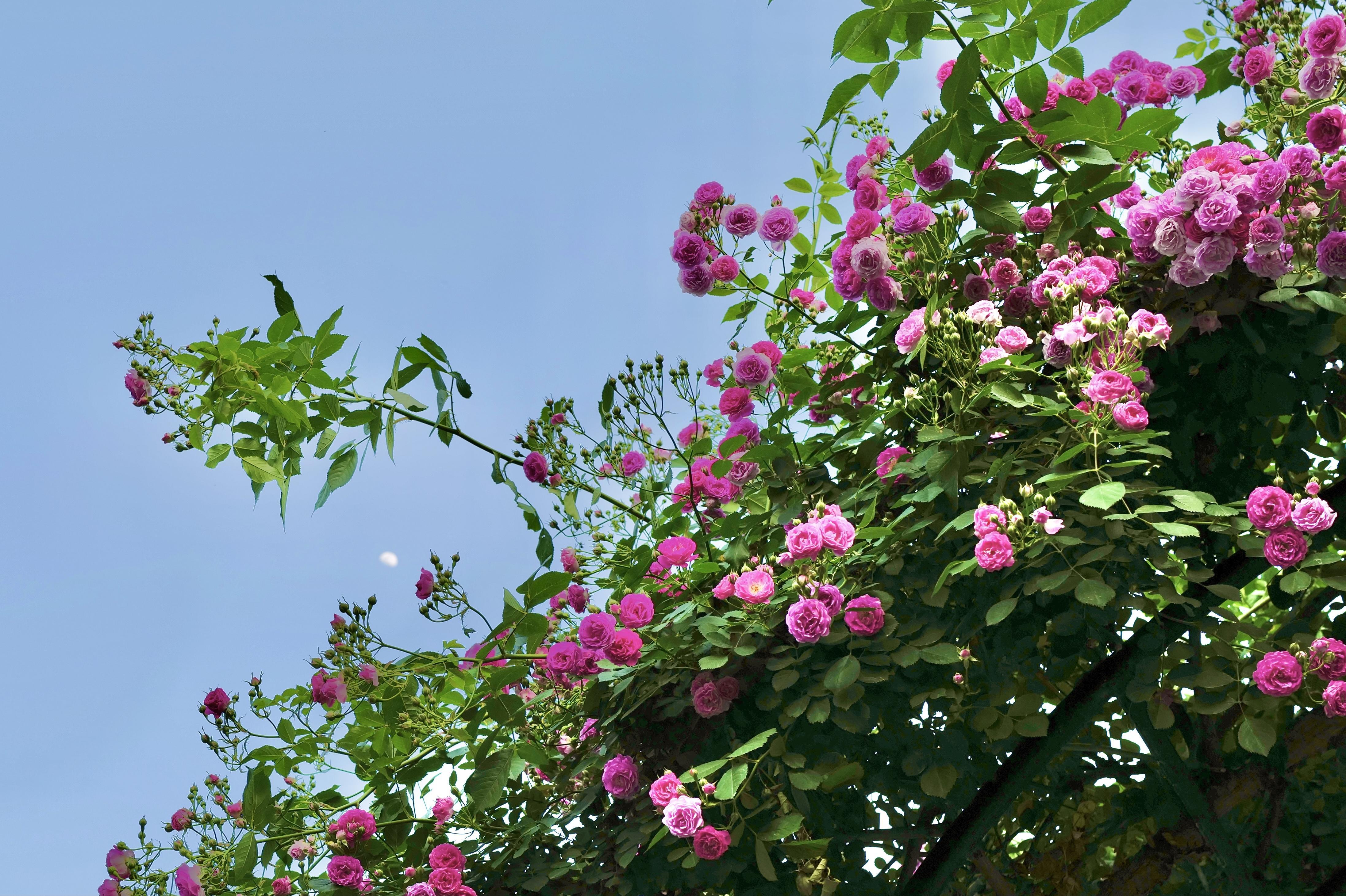 太阳还没有完全下山,月亮的半道影子已经渐渐悬浮在天边。映在蔷薇花海的边缘,显得梦幻不真实。