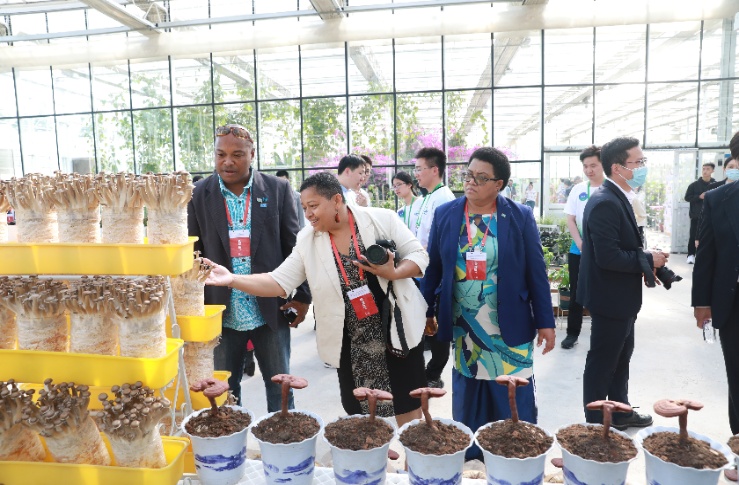参会人员还参观了江苏省农业科学院与太平洋岛国相关的高产抗逆农作物品种、农产品精深加工技术、农业绿色技术及苏农科品牌产品等展示成果;旱地作物与特色蔬菜场、农牧结合与种养循环场;农机具实物及场景展示;智能温室智慧农业、都市农业及立体种植模式等,温室片区的农业信息馆、蝴蝶生态馆、草莓资源馆、葡萄栽培馆、蔬菜栽培馆、高新豆博馆、花卉资源馆。