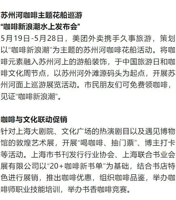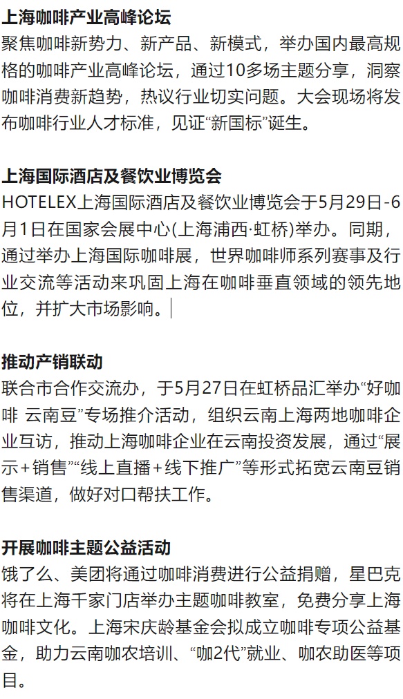 瑞幸上海650家门店、麦咖啡上海所有门店、NOWWA咖啡全国1800家门店以及饿了么、美团、建设银行、永璞等开启“请你免费喝咖啡”活动,德必、幸福里等全市百家文创园区也举办免费喝活动。5月26日-5月30日下午14:00-16:00,携手云南产地,在虹桥火车站等交通枢纽,免费送出抵达上海的第一杯咖啡。