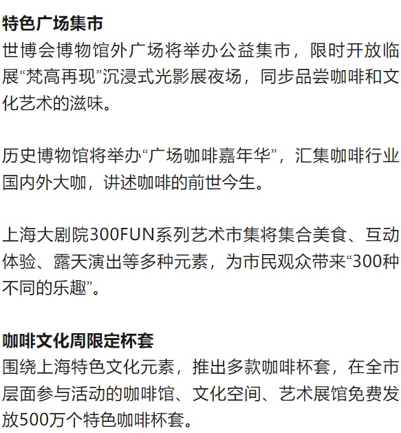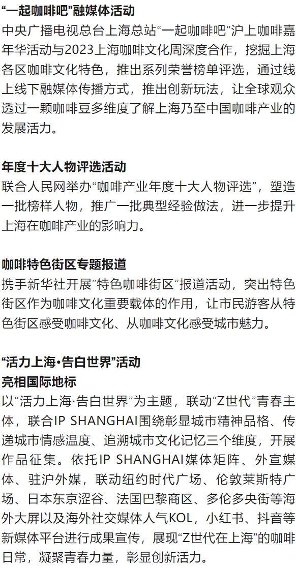 2023上海咖啡文化周将继续依托各区,结合各区特色资源,开展各类主题咖啡活动,扩大活动覆盖面的同时,形成贯穿全年的效应,立体展现上海城市的魅力。