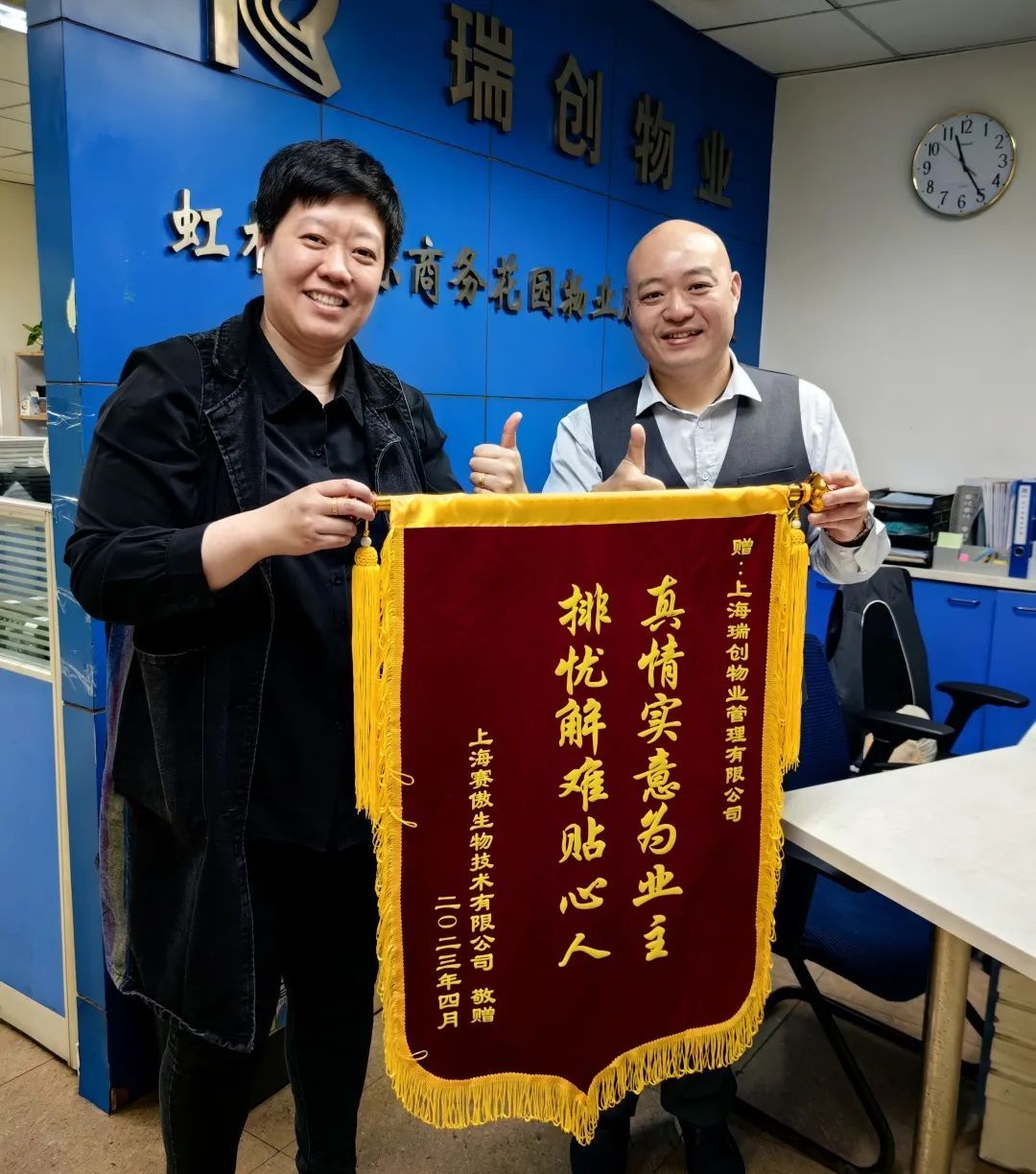 近日,上海赛傲生物技术有限公司唐经理为瑞创物业虹桥国际商务花园管理处送来了一面写有“真情实意为业主,排忧解难贴心人”的锦旗。该公司领导高度赞扬了项目负责人倪旭峰及其管理团队,对物业及时反应、高效处置、成功解难表示衷心的感谢。