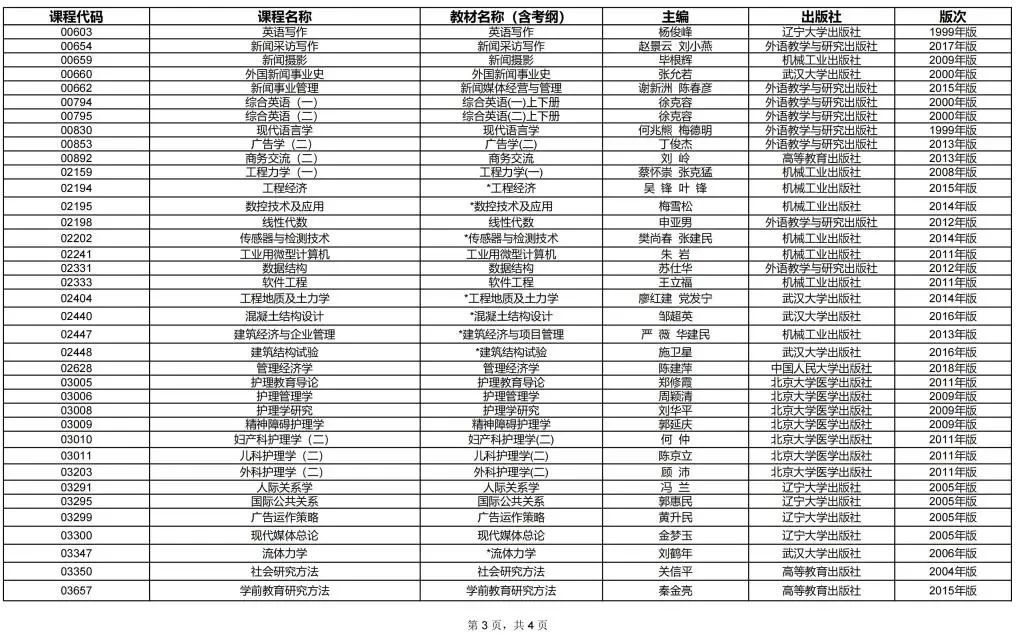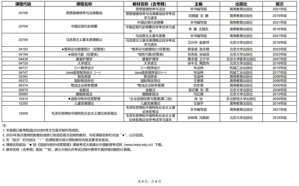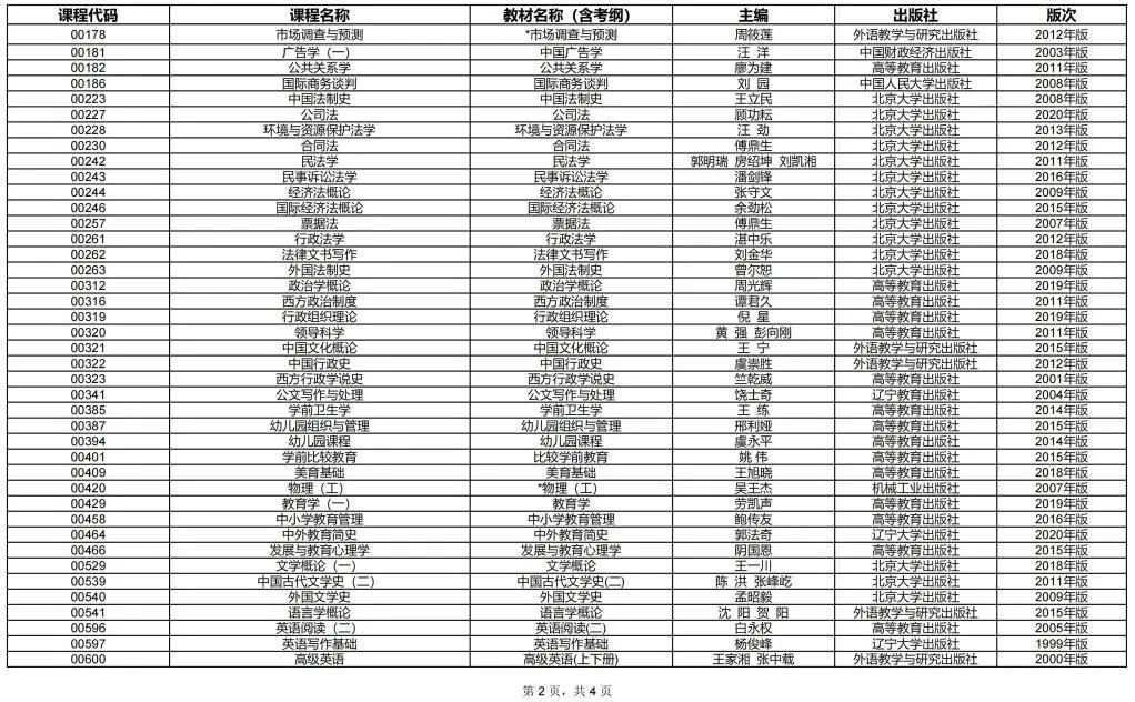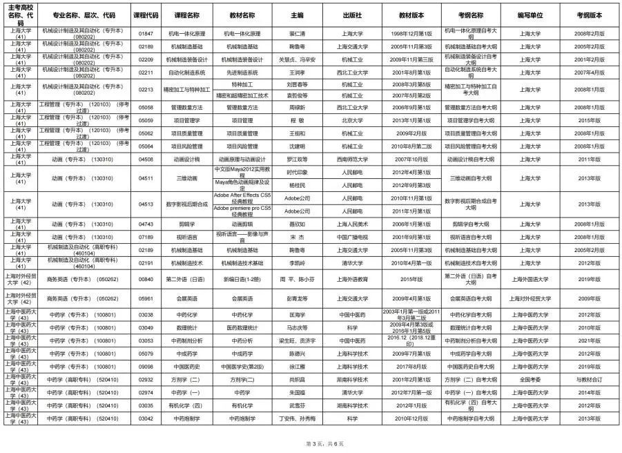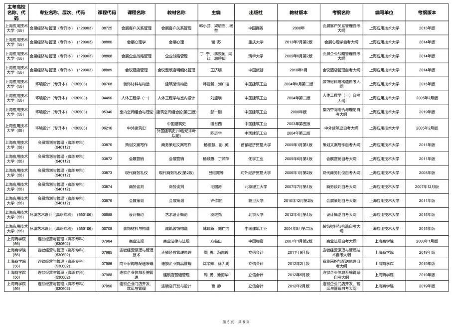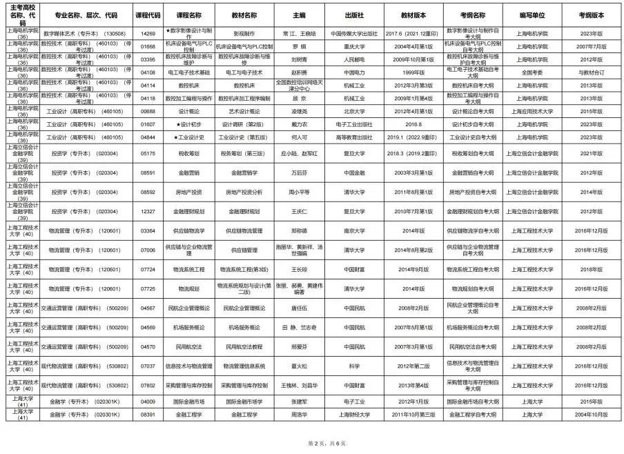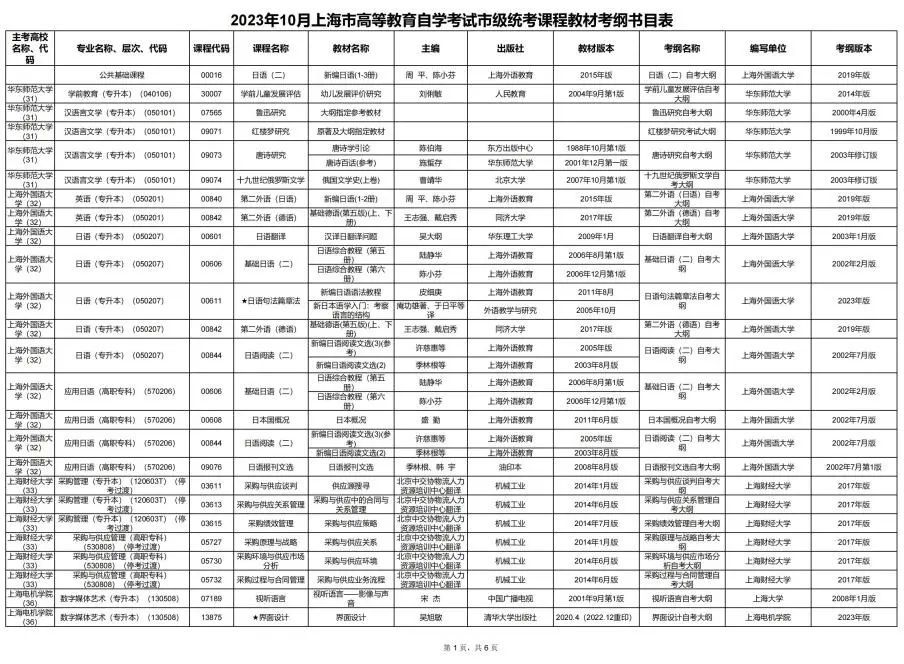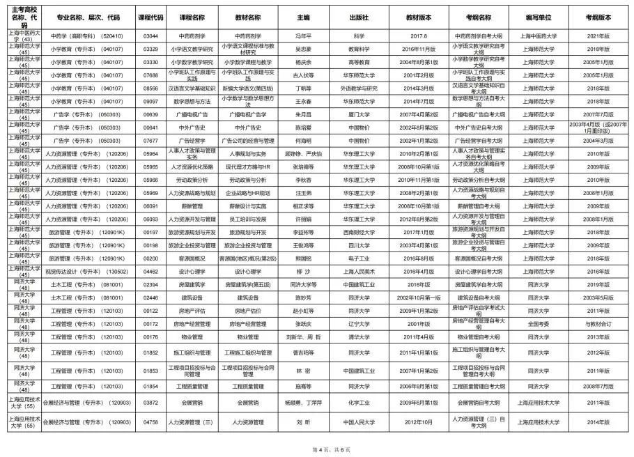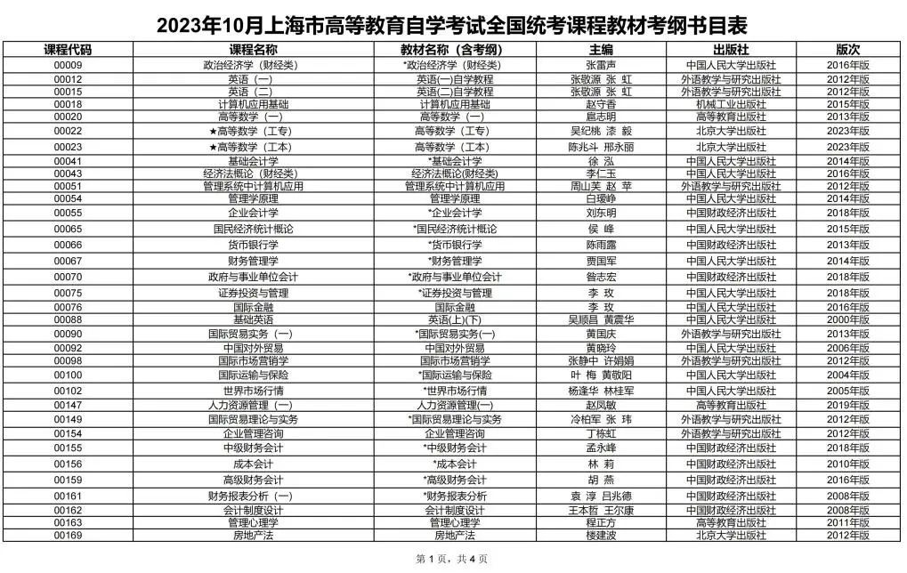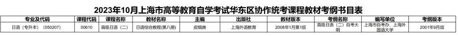沪2023年10月高等教育自学考试教材考纲书目表公布