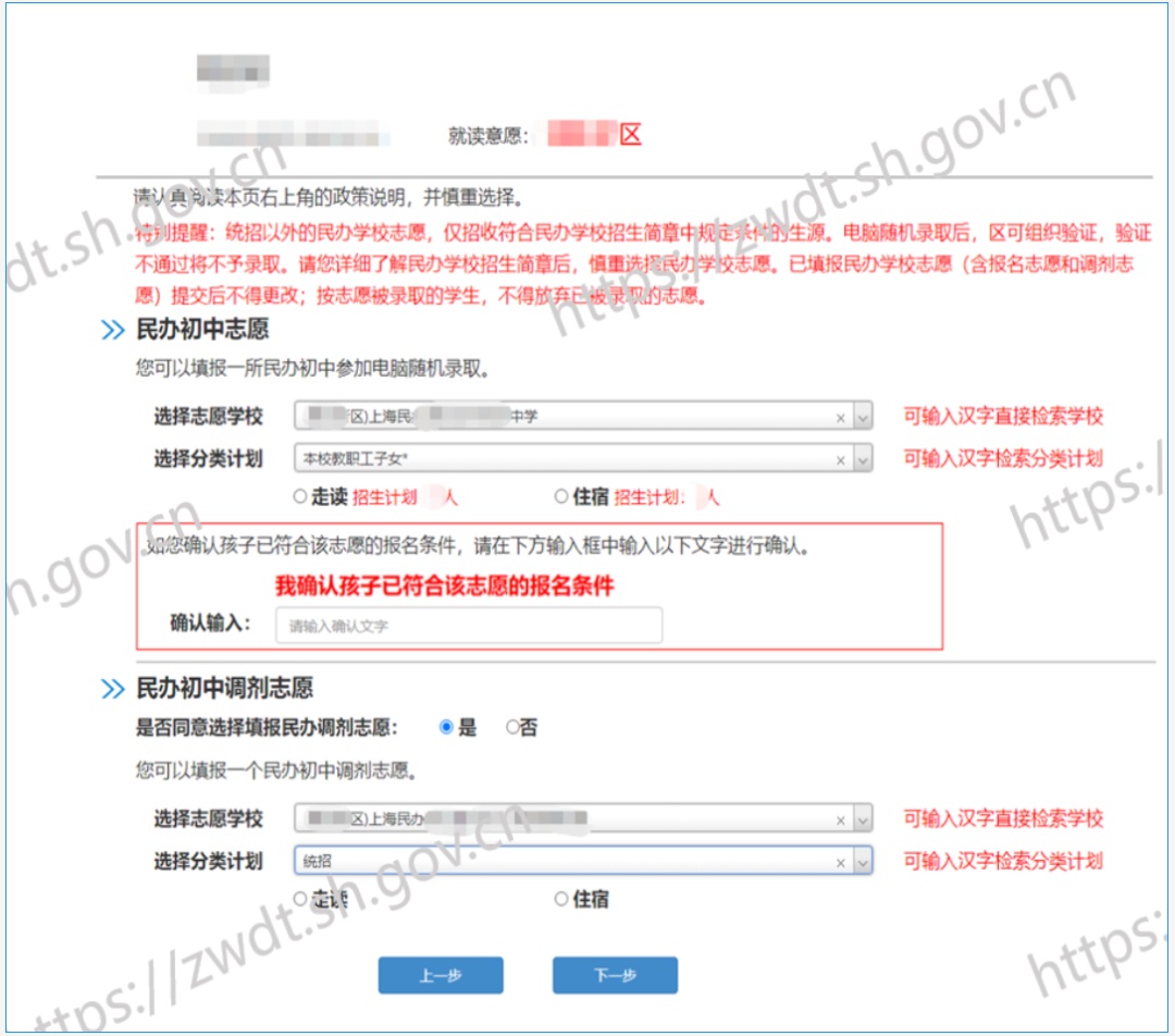 特别提醒:选择分类计划为“统招”以外的民办学校志愿的学生,需要确认符合该志愿的报名条件。