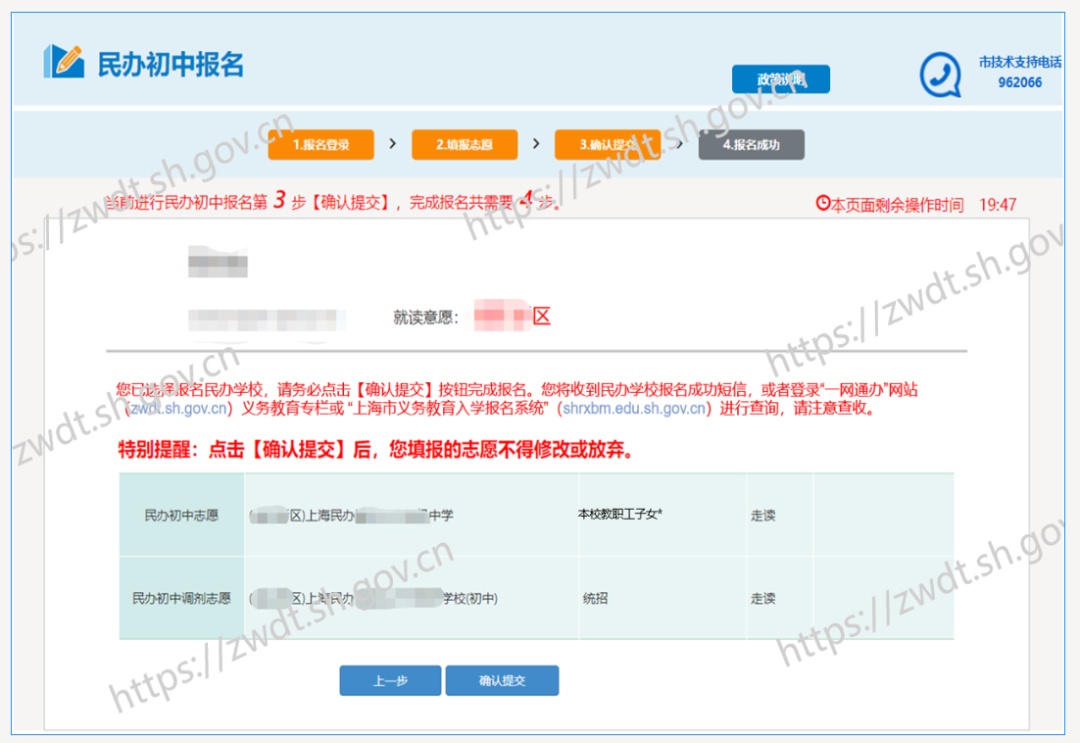 在该步骤,请确认是否是您在上一步中所选志愿学校,志愿一经提交无法修改,请慎重提交。