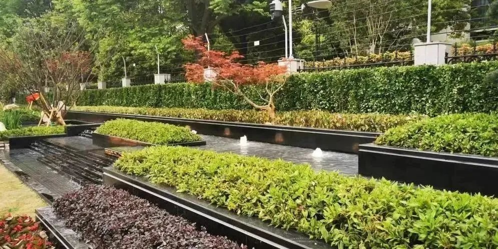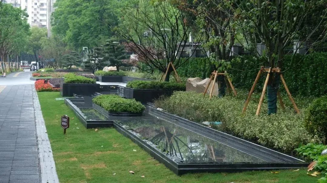 新恢复的绿地在设计在景观布置上以对称、统一、大气为主要原则,通过建筑元素的提取,打造高差变化增加景观层次感,在植物选择上以整齐修剪的绿篱为基调,采用松、枫、梅作为骨架,保留水景与造型松组合,刚柔相济,庄重又不失亲和力,简洁的景观语言非常符合城市审美。