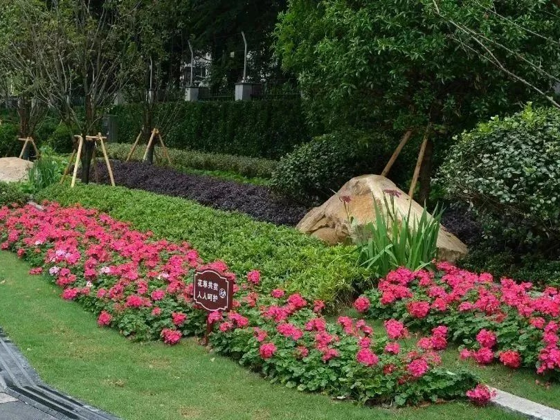 武宁南路沿线新种的行道树为红花七叶树,七叶树以树形优美、花大秀丽为主要特征。七叶树下因地制宜采用自然式配植的绿化带将沿线行道树串连,与绿地交相辉映,构成一幅和谐优美的画卷。