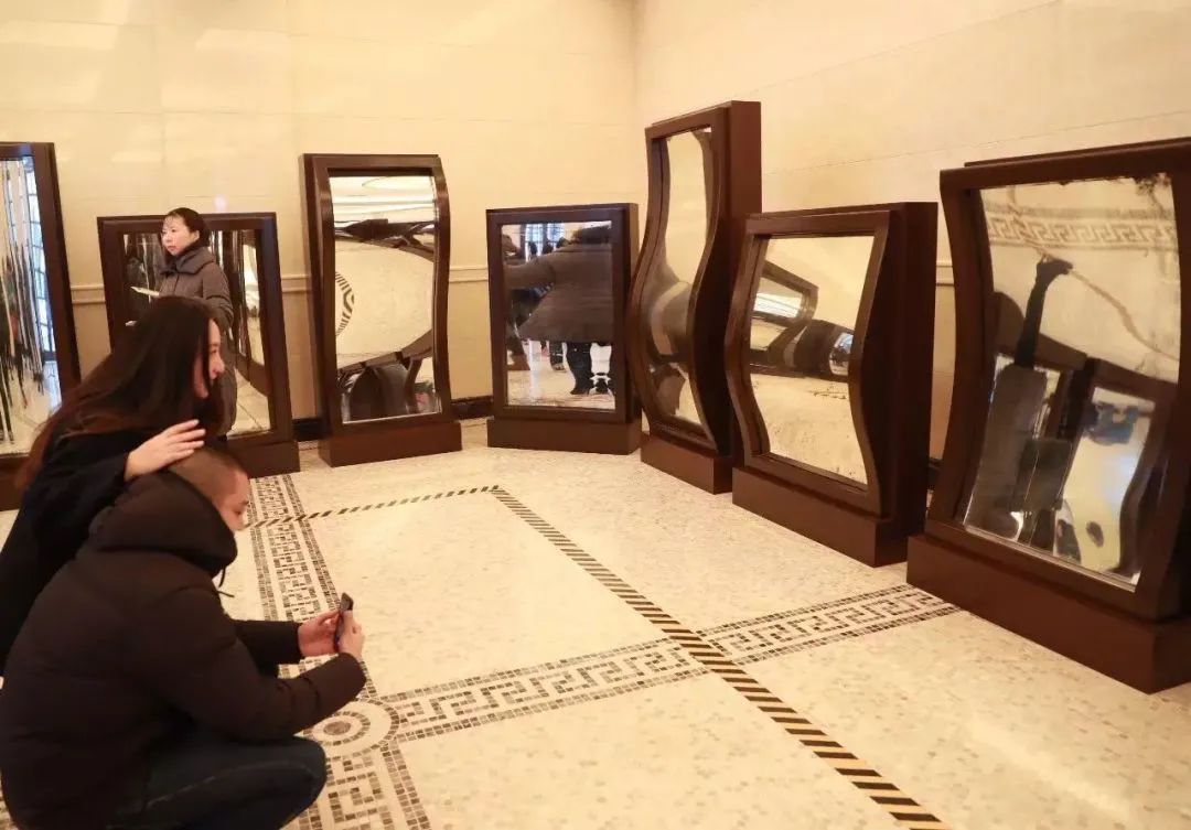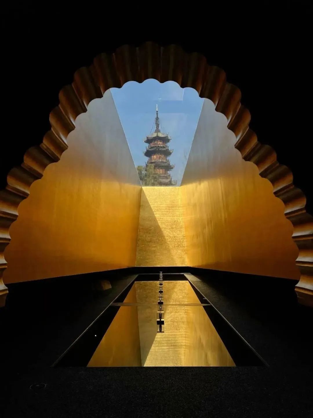空间天花板是玻璃天幕,有一层薄薄的水幕,阳光穿透进来,水光朦胧间透出龙华寺倒影,隔着水幕看古塔,又美又梦幻!