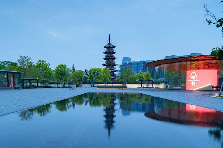 这片的神秘空间名为“塔影空间”,在龙华古寺塔背后的广场地下。刚踏入就会被这片静谧宁静的空间所吸引。