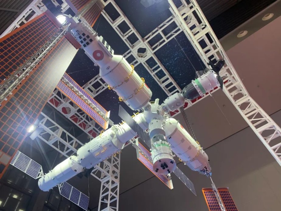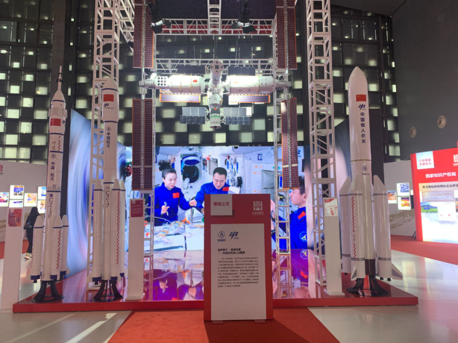 载人火箭好似要一飞冲天,1:10的中国空间站模型“漂浮”在空中。刚进入中国品牌博览会的“创新100+”精品展区,“镇馆之宝”中国空间站1:10模型便迎面而来。