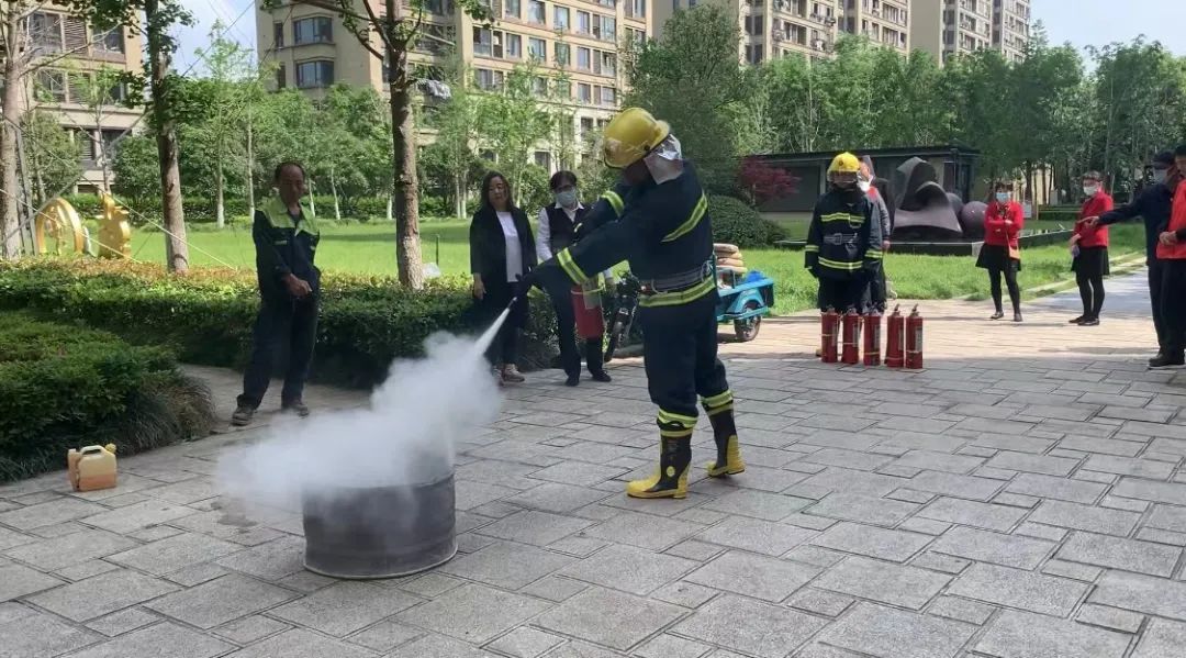在室外开阔区域,微型消防站工作人员现场讲解火灾防控基本知识,示范消防设备的使用方法。