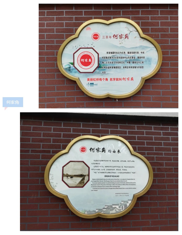窗棂分别讲述了何家角的百年由来、百年小学、百年人物以及何家角徽章、《美丽虹桥 美丽何家角》歌曲、筑梦新时代等内容,其中不乏配以英文翻译,向人们展示了何家角的百年历史,也让居民对这座美丽家园的古今变迁一目了然。