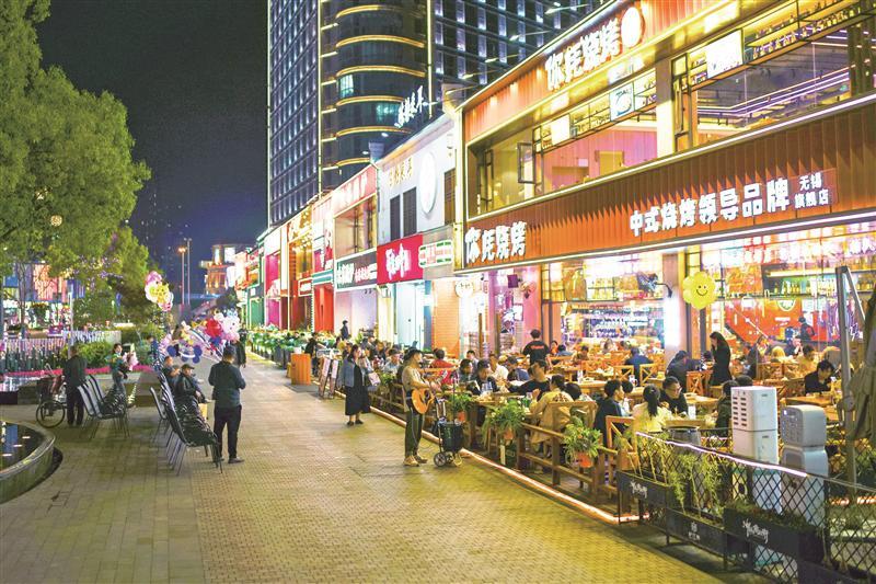5月的锡城舒适惬意。午后,三三两两的市民坐在周新里商业街Z咖啡的户外沙发椅上,或聊天、或阅读,闲适从容。入夜,霓虹闪烁的湖滨商业街,大部分市民选择露天外摆餐位,或烧烤、或火锅,酣畅淋漓。