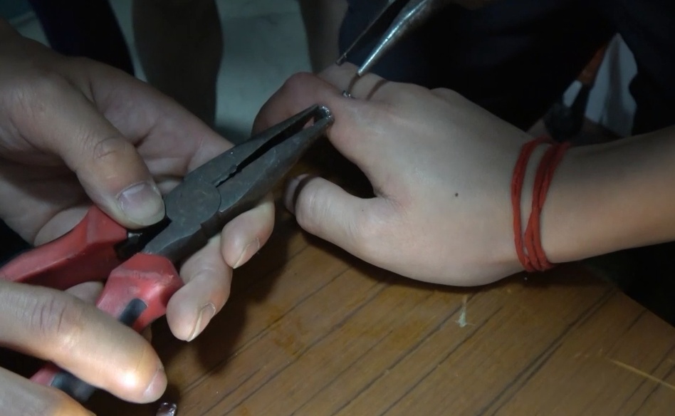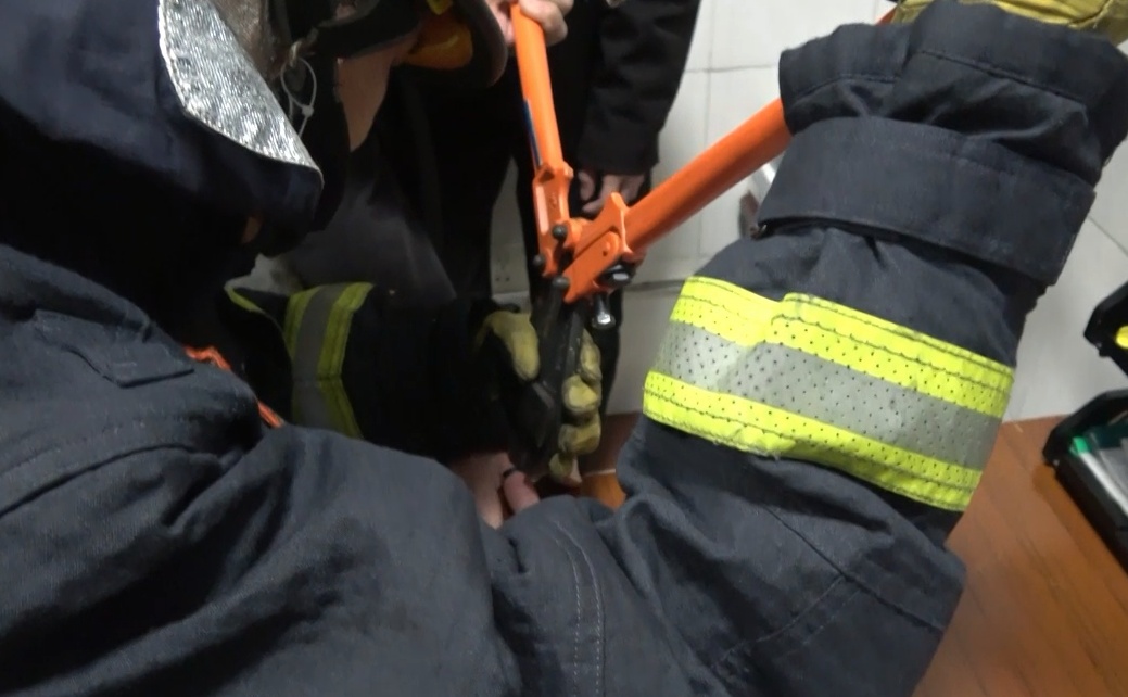 起初,消防员打算用绕绳将戒指取出,试了几次未果。随后,消防员用老虎钳、小钳子等工具,试图将戒指剪断,由于戒指硬度较高,剪了几次戒指纹丝不动。最后,消防员不得不换上大力钳。