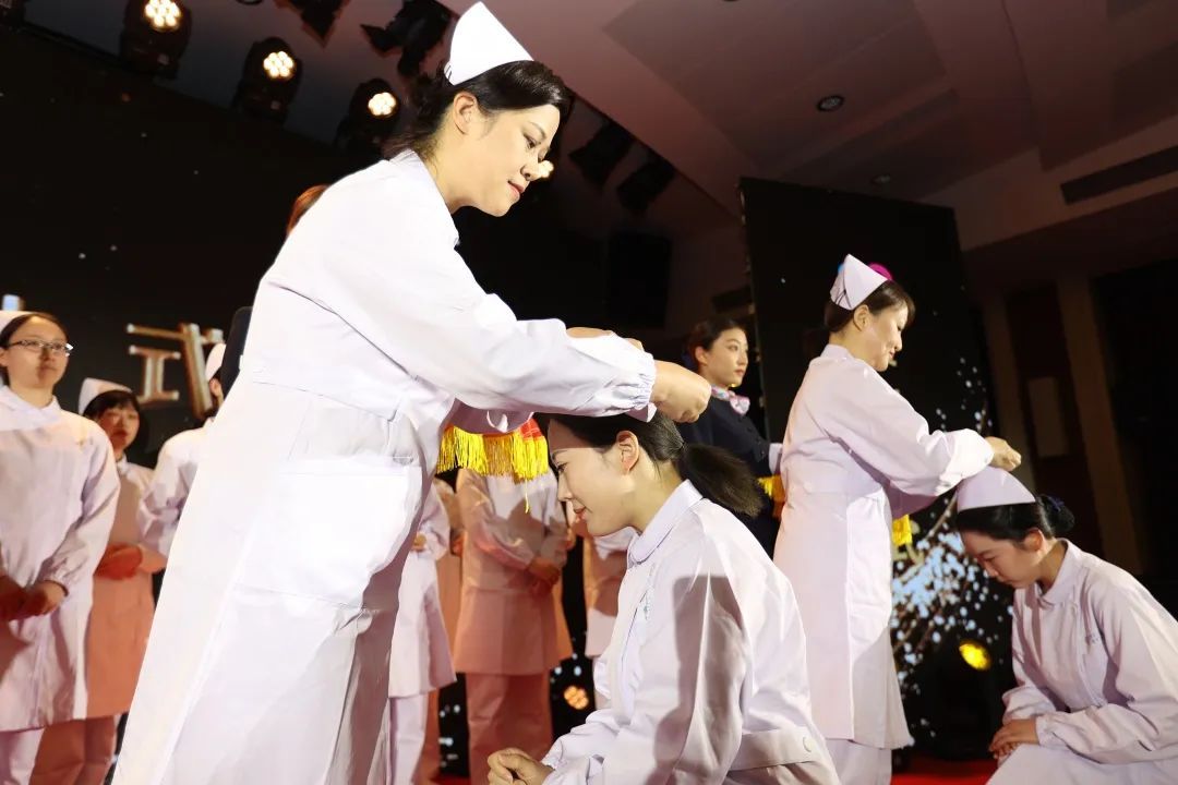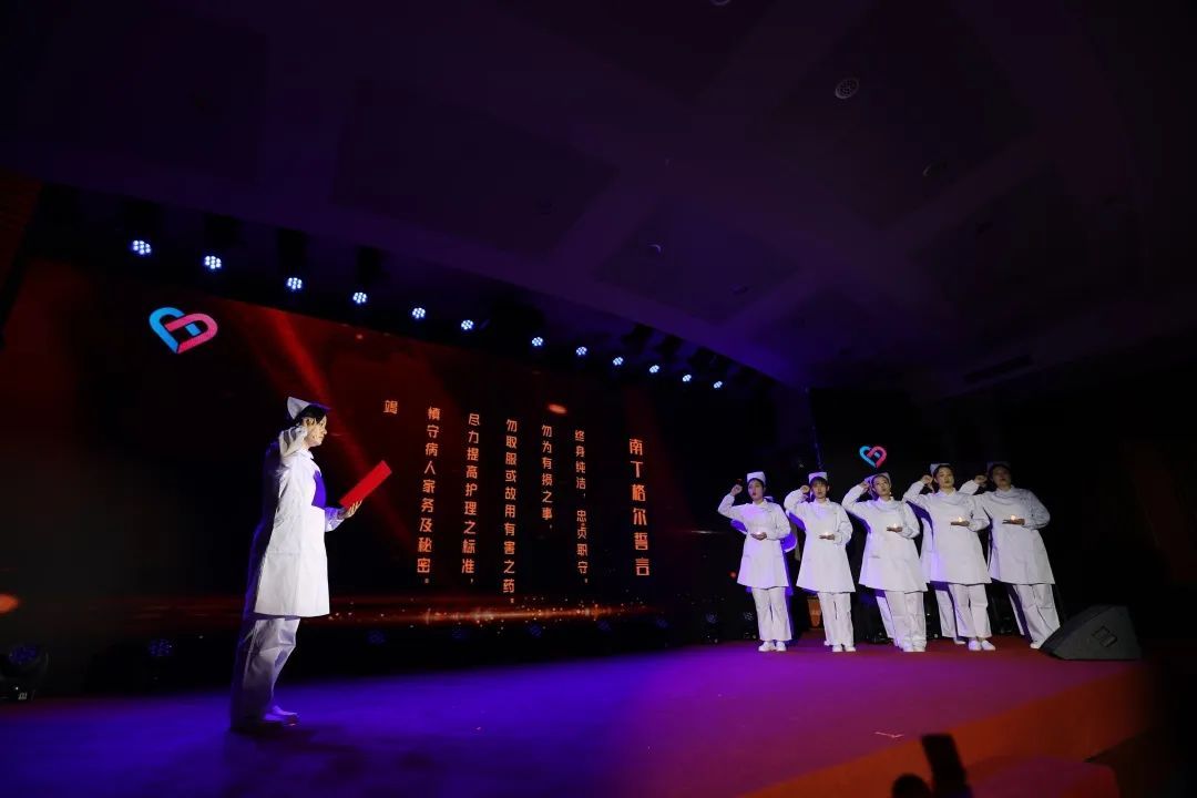 年轻的护士们踩着节拍,迈着整齐而坚毅的步伐走上舞台,在护理前辈殷切目光的注视下戴上燕尾帽,接过“南丁格尔”的责任,以爱之名坚守使命和初心。护士代表在领誓人的带领下,郑重宣读南丁格尔誓言。
