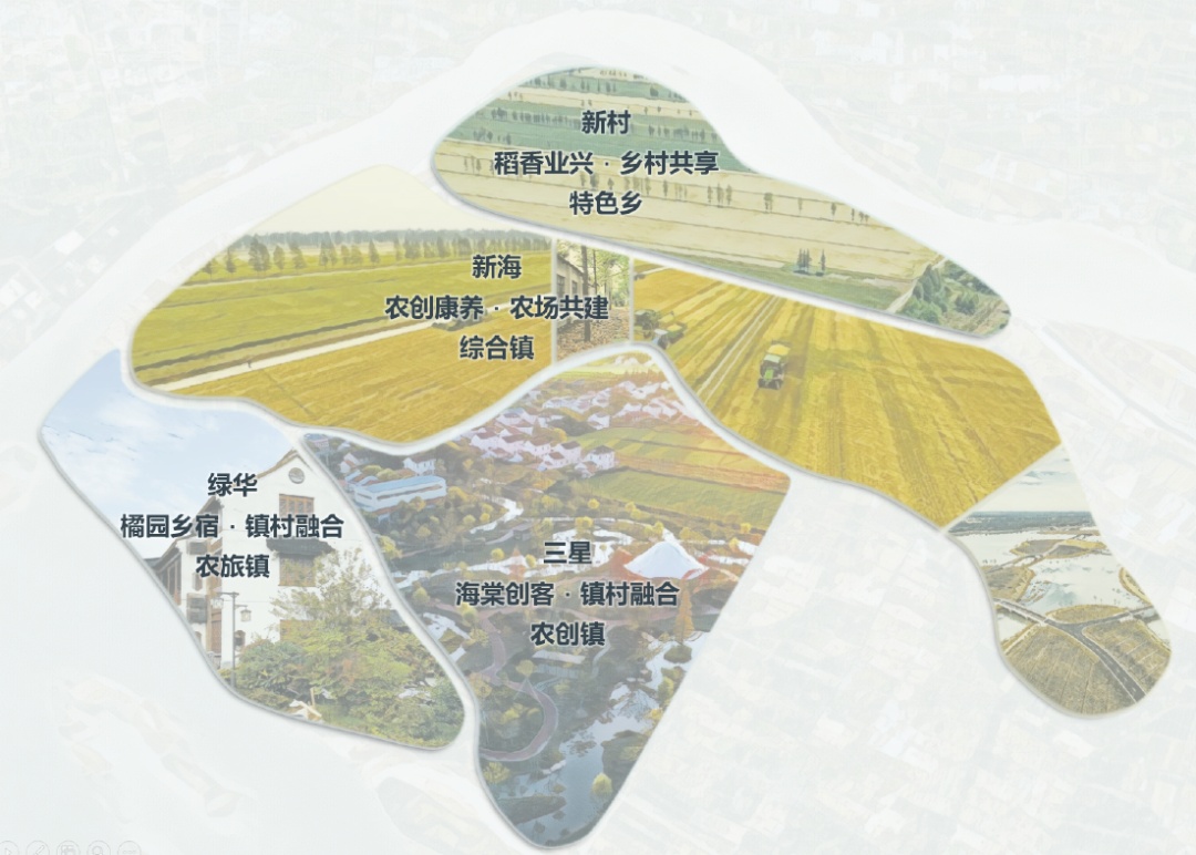 绿华镇定位为“橘园乡宿、镇村融合的农旅镇”,三星镇定位为“海棠创客、镇村融合的农创镇”,新海镇定位为“农创康养、农场共建的综合镇”,新村乡定位为“喜田稻米、乡村共享的特色乡”。