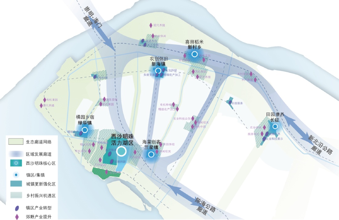西沙城镇圈总体形成“一心、双廊、多片”的网络式发展格局。以西沙明珠湖为发展核心,规划“陈海公路-沪崇高速”和“新北沿公路-崇海通道”为南北两条交通廊道,打通与城桥片区与长江口北端的快速联系,带动区域联动发展;形成多个位于镇区、农场社区的城镇更新强化片区,重点推进镇区产业转型,另外划分多个乡村振兴机遇片区,充分挖掘片区特色,形成差异化郊野特色产业品牌。