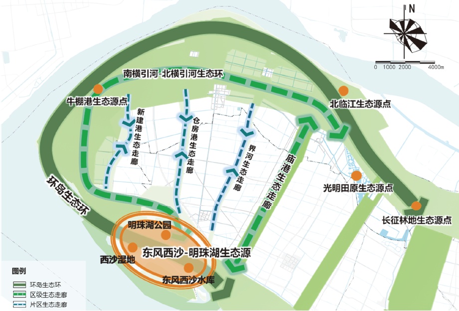 西沙城镇圈形成“一源四点 两环四廊”的总体生态结构。一源四点:形成“东风西沙-明珠湖生态源”,进一步识别牛棚港、北邻江、光明田原和长征林地等4个生态源点。两环:形成环岛生态环和“南横引河-北横引河”一主一次两条生态环,构建沿江沿骨干河道的片区生态环廊。四廊:在庙港区级生态走廊基础上,沿新建港、仓房港和界河构建三条片区级南北向生态走廊,完善片区生态网络。