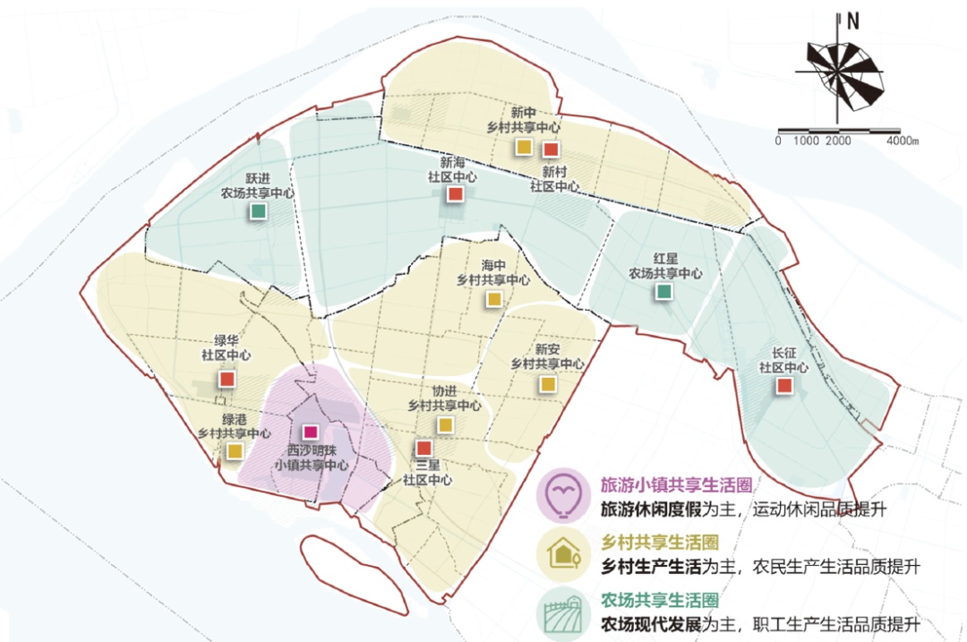 以西沙明珠湖为核心,构建西沙生活圈,实现城镇高能级服务设施全覆盖,规划辐射片区的文化、体育、旅游服务等设施。以绿华、三星、新海、新村镇区以及长征为社区中心,构建覆盖全乡镇的社区生活圈,配套满足镇域需求的公共服务设施。以绿港、协进、海中、新安、跃进、红星和新中为核心,构建旅游小镇、乡村、农场三类共享生活圈,分类配建乡村级公共服务设施。