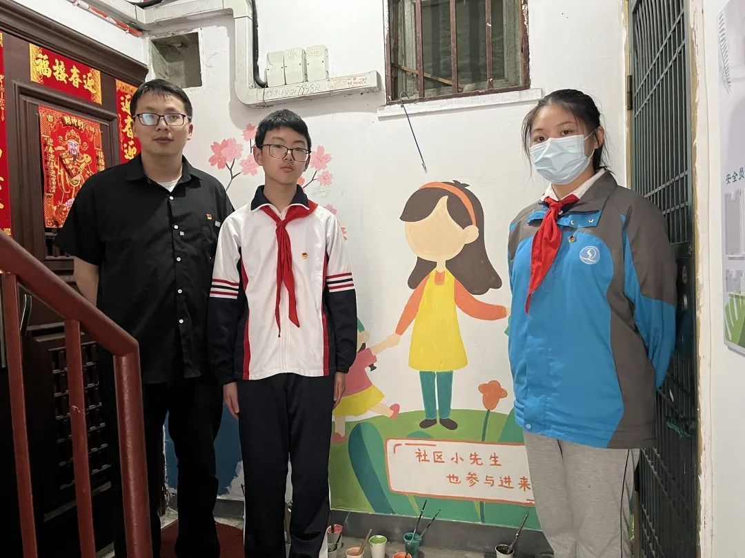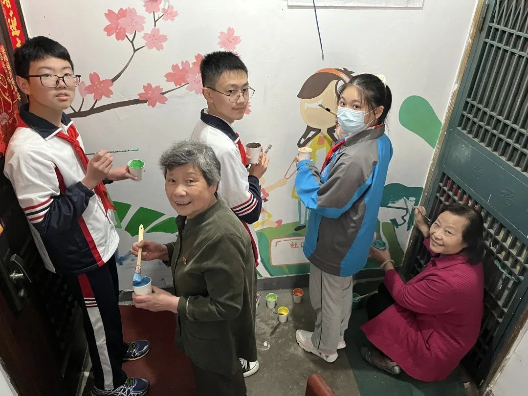 经过宣传动员,居民们提前清扫整理楼道,营造了良好楼道环境。随后便到了“特别环节”——楼道彩绘。从彩绘的形式、图案到风格、表现手法,长一居民区党总支与居民一一沟通,了解居民想法,居民得以全程参与,积极性非常高。同时,邀请结对共治单位吴淞二中的陈老师带领6名学生一起参与。楼道里的老党员携手学校里的年轻团员,为描绘美丽楼道共同出力。在老师的指导下,大家调颜料、洗画笔、勾线条,分工有序、各司其职,一会儿用粉刷进行大面积涂色,一会儿换笔刷进行细致涂描。以墙为卷,在墙面上描绘出一幅幅生动的图案。