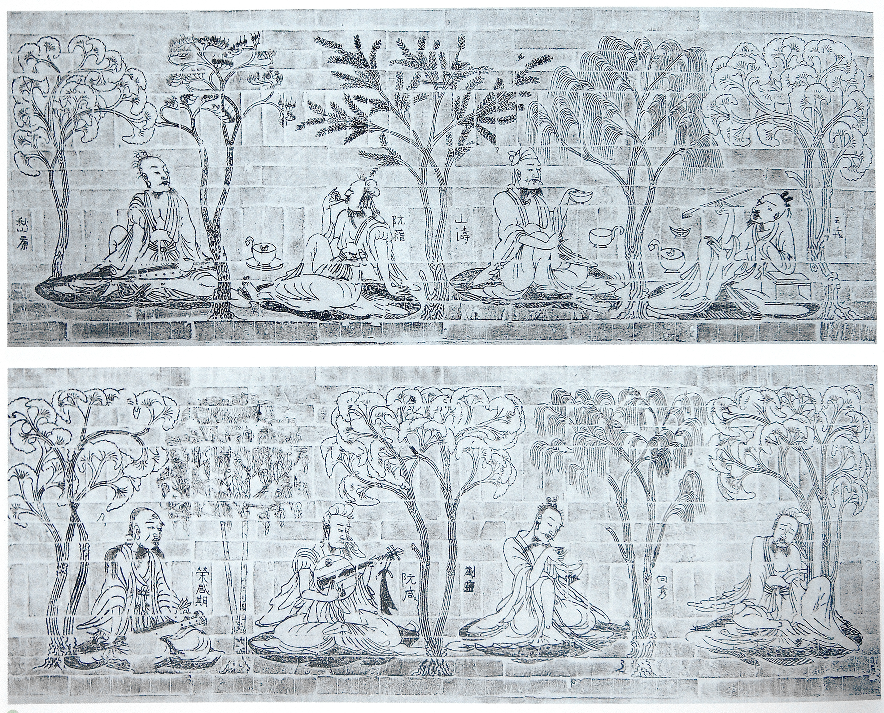 “竹林七贤”是魏晋时期的七位名士,他们常常结伴游于山林,沉湎于酒乐,画面上的另一个人物为春秋时的高士荣启期。八人都是席地而坐,各具神态,每个人物身旁标明身份,相互间以银杏、松树、槐树、垂柳等树木间隔,是一组既各自独立又和谐统一的大型画像砖组画。