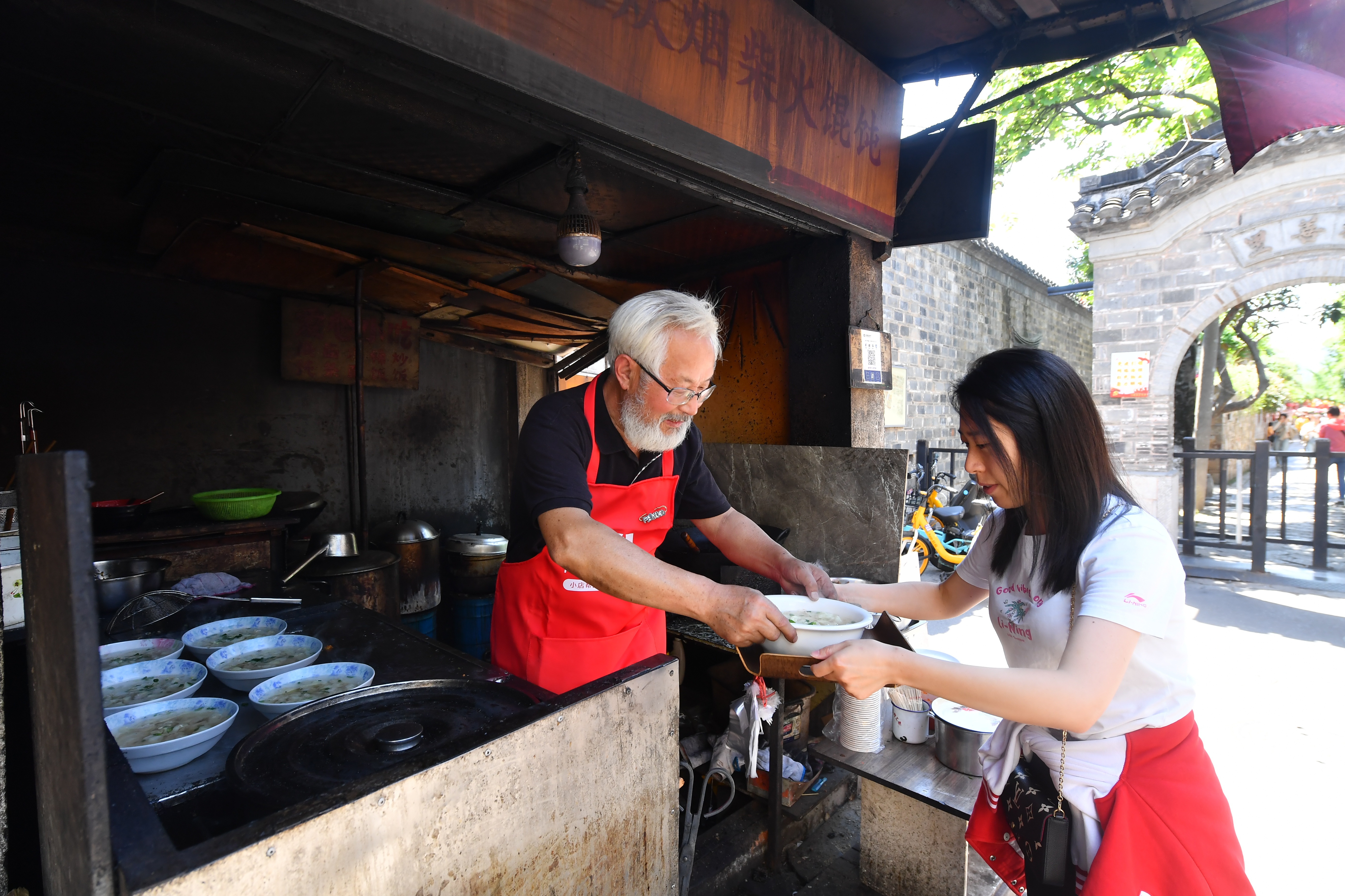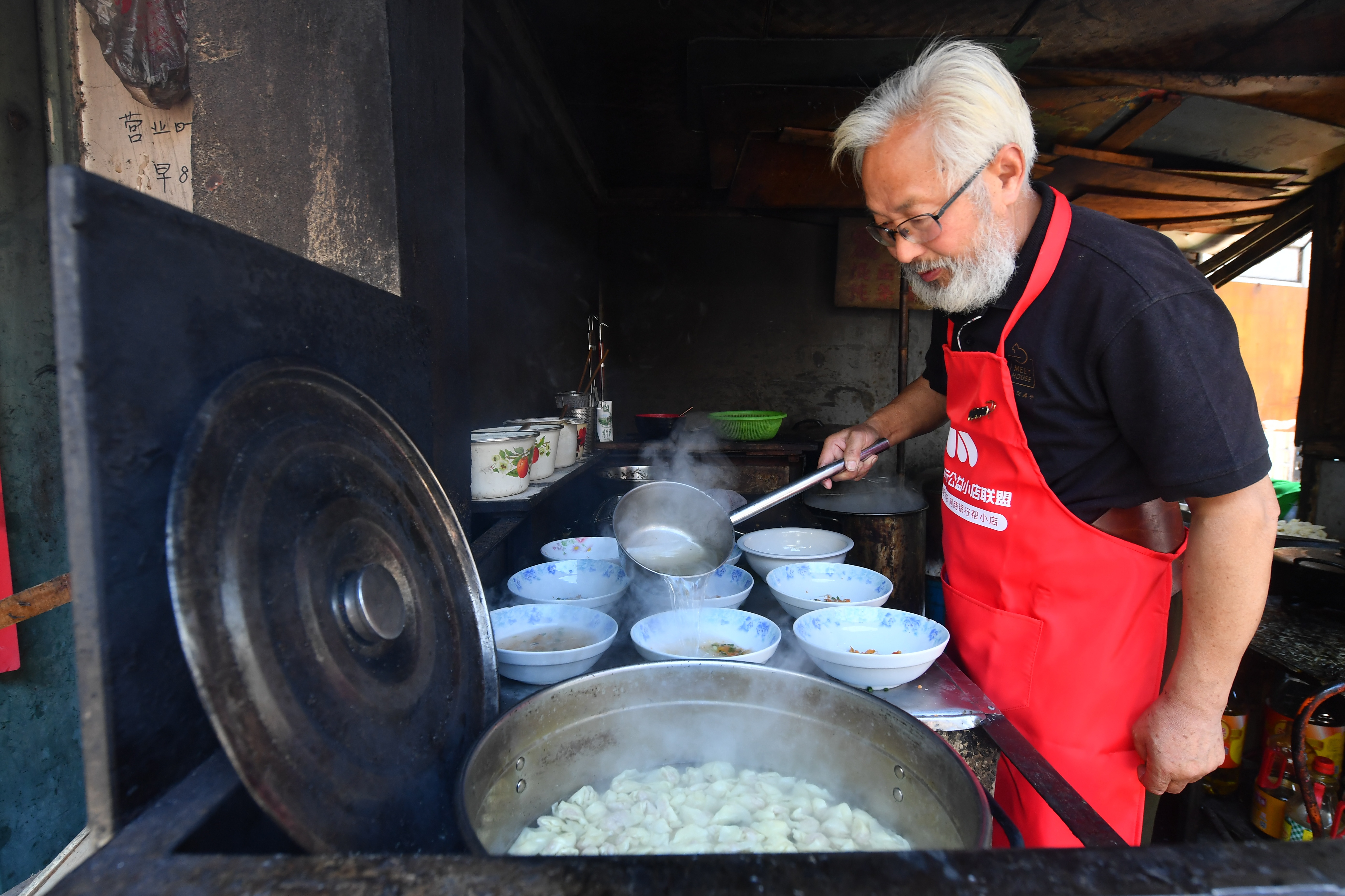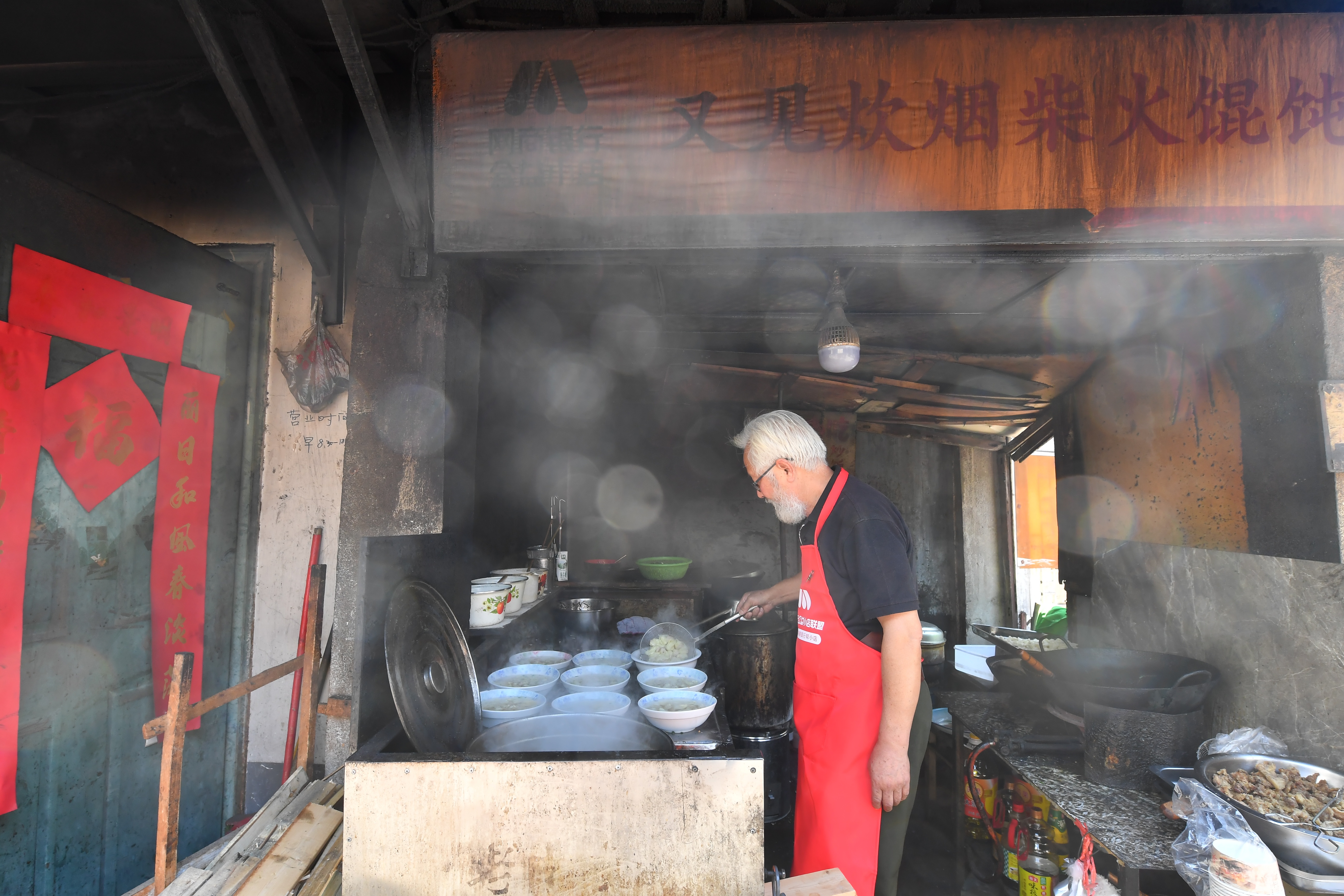 清晨7点,尹爷爷来到小店。他挪开围挡,撤掉帘布,伴着熹微的晨光点燃炉子,一缕炊烟升起。侧耳聆听巷口,脚步声渐渐密了起来。新的一天又开始了。