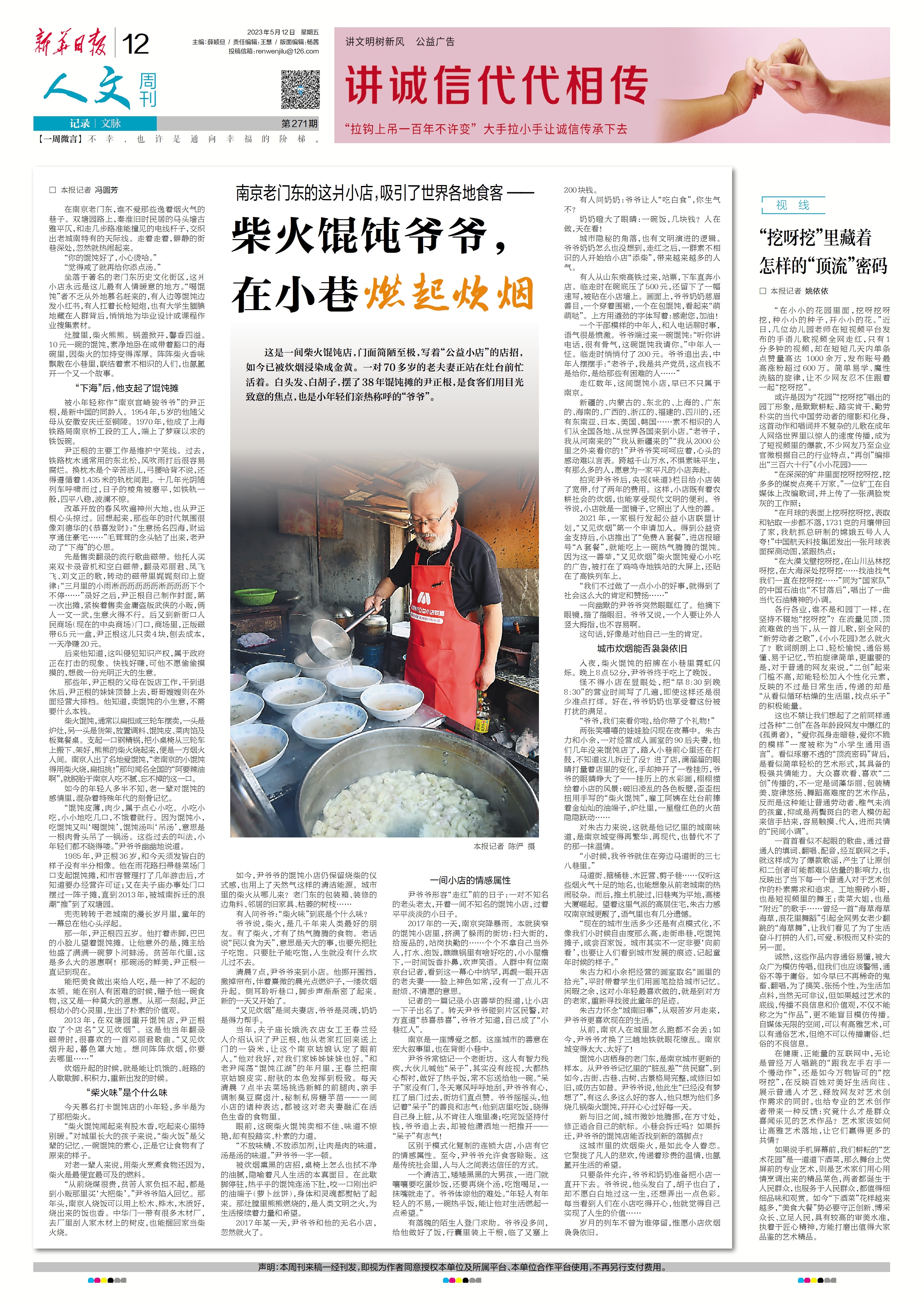 尹爷爷形容“走红”前的日子:一对不知名的老头老太,开着一间不知名的馄饨小店,过着平平淡淡的小日子。