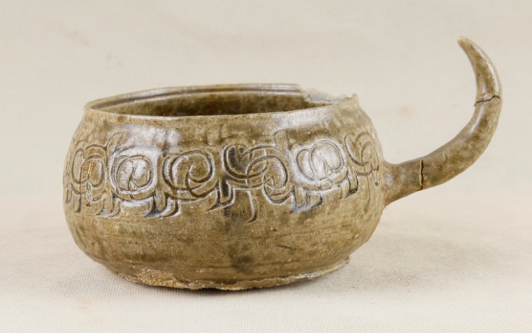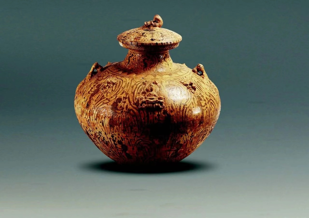 “这件原始青瓷器造型独特,最引人注目的就是它腹部的牛角状把手和拍印的一周勾连双勾线‘S’形纹,距今2500多年了,但保存得非常完好。早期原始青瓷器大多是以食器、饮器、祭器等形式出现,也是后代成熟瓷器的前身。”阖闾城遗址博物馆陈列部部长丁兰兰说。
