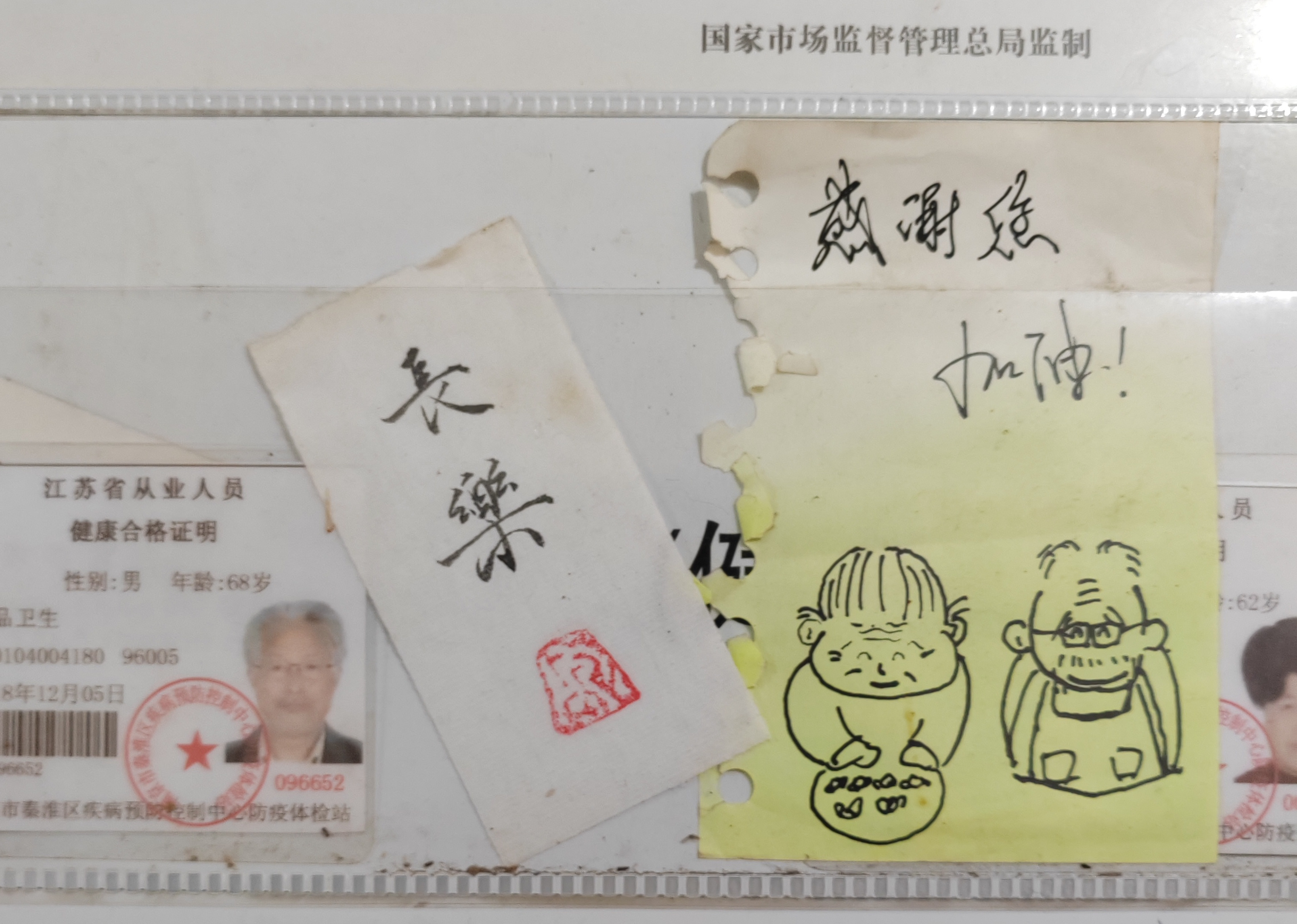 有人从山东乘高铁过来,站票,下车直奔小店。临走时在碗底压了500元,还留下了一幅速写,被贴在小店墙上。画面上,爷爷奶奶慈眉善目,一个戴着围裙,一个在包馄饨,看起来“萌萌哒”。上方用遒劲的字体写着:感谢您,加油!