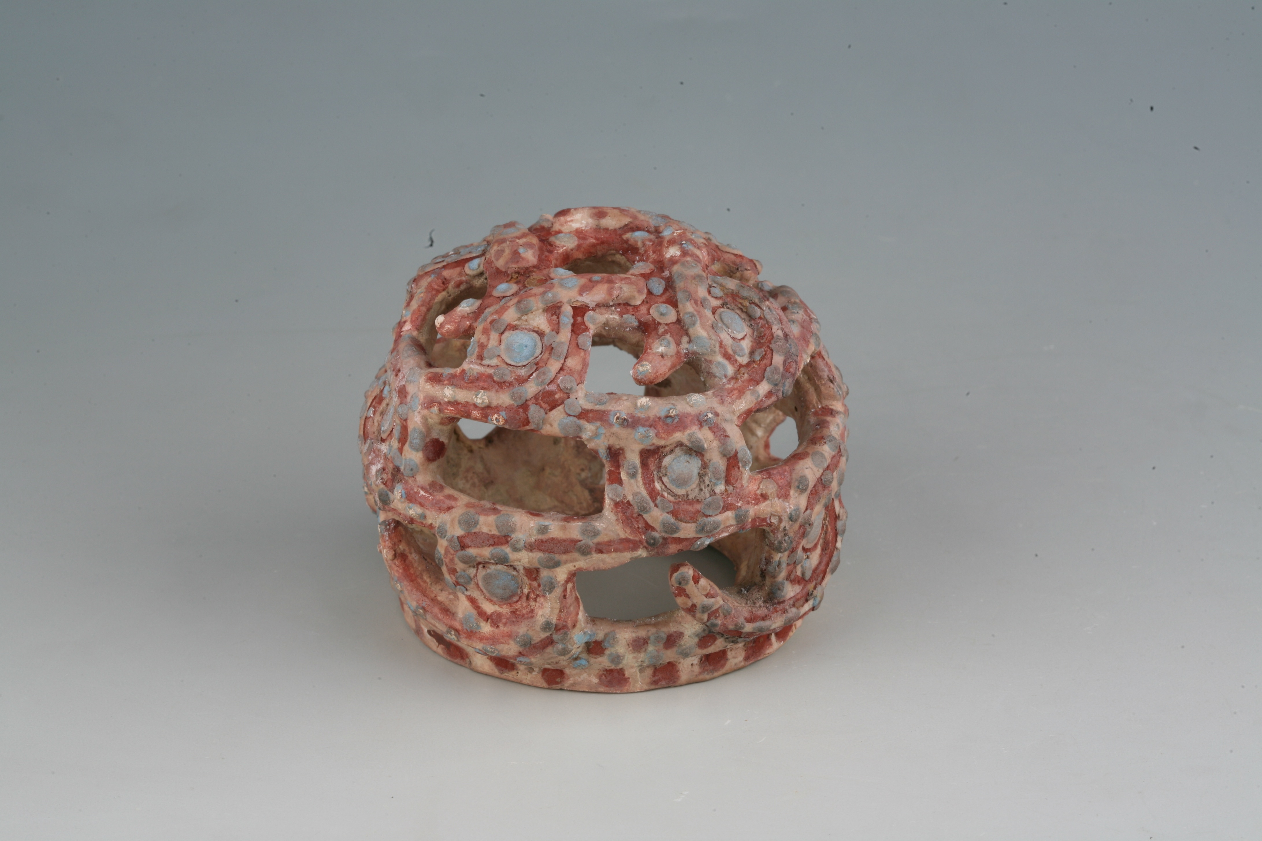 鸿山遗址出土的琉璃釉盘蛇玲珑陶球形器,由八条盘蛇构成,是我国最早的琉璃陶胎器。它总体呈球形,中间镂空,整个球身由盘曲的八条蛇互相交叉缠绕组成,有的蛇用口紧紧衔住另一条蛇的尾或身体,有的蛇则上扬着蛇头,紧睁着圆目,口微微张开,蛇身盘成圆圈状,生动形象。