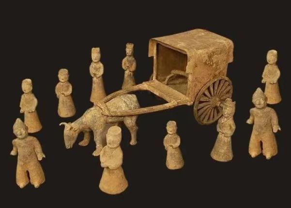 六朝博物馆收藏有东晋时期的陶牛车及俑群,均为陶质,陶牛躯干瘦长,匀称有力,双角前曲,两耳向后,似乎在拉着车缓步前行。牛车四周散有侍从俑群,有的牵牛,有的拢手站立,形态各异。