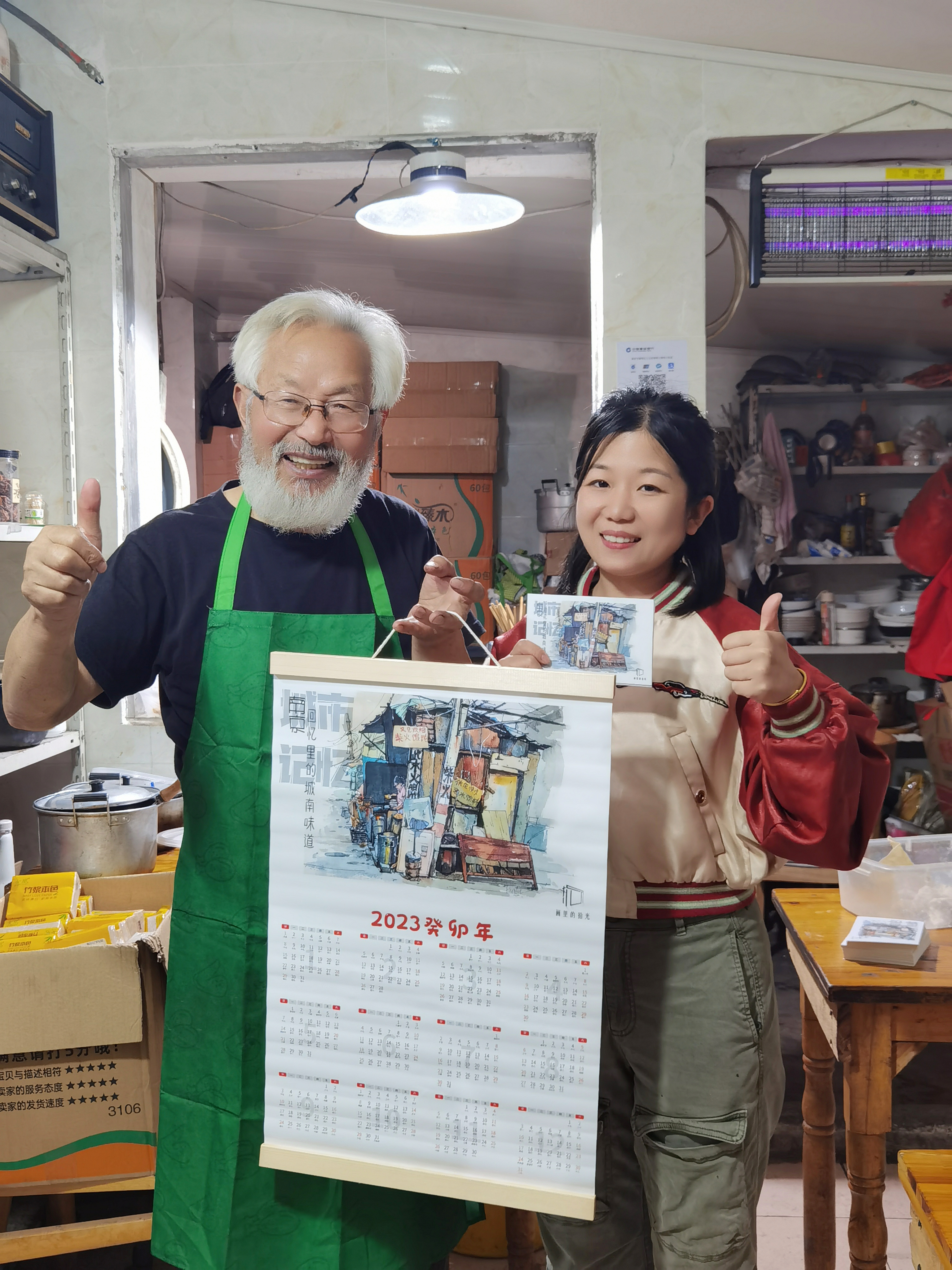 两张笑嘻嘻的娃娃脸闪现在夜幕中。朱古力和小余,一对经营成人画室的“90后”夫妻,他们几年没来馄饨店了,踏入小巷前心里还在打鼓,不知道这儿拆迁了没?进了店,滴溜溜的眼睛打量着店里的变化,手却抻开了一卷挂历,爷爷的眼睛睁大了——挂历上的水彩画,栩栩描绘着小店的风景:破旧凌乱的各色板壁,歪歪扭扭用手写的“柴火馄饨”,雇工阿姨在灶台前捧着金灿灿的油端子,炉灶里,一星橙红色的火苗隐隐跃动……