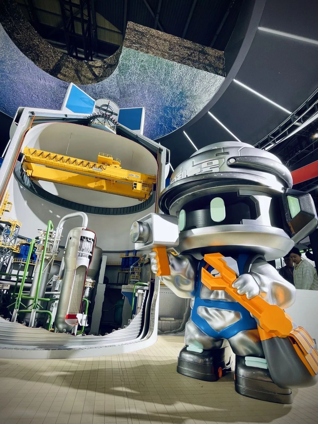和普通展位不一样的是,面积达400㎡的国家电投展位正上方,安上了一个特殊的“大帽子”。它参考了“国和一号”核岛顶部的非能动安全壳冷却水箱和钢穹顶造型,代表着最关键的核安全设计理念:一旦发生事故,高位的水会在重力的作用下流到安全壳表面,同时对安全壳壳体实施外部喷淋形成冷却水膜,降低安全壳内的压力和温度,保证安全壳这道安全屏障不受损坏。