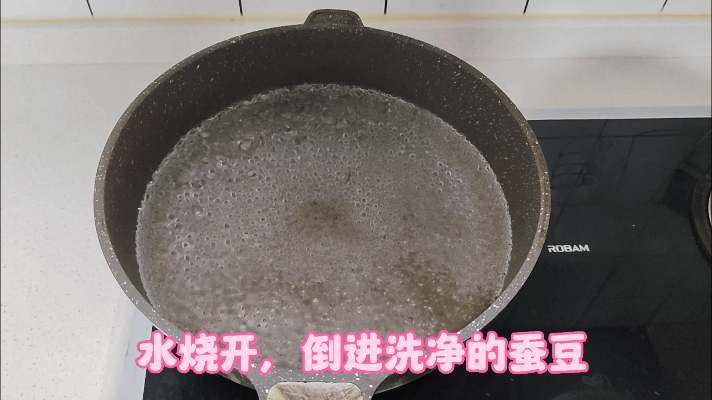 1、烧沸一锅水,加入一大勺盐,放入蚕豆,加入一勺食用油,瓣汆烫熟,取出控干水分,放凉。