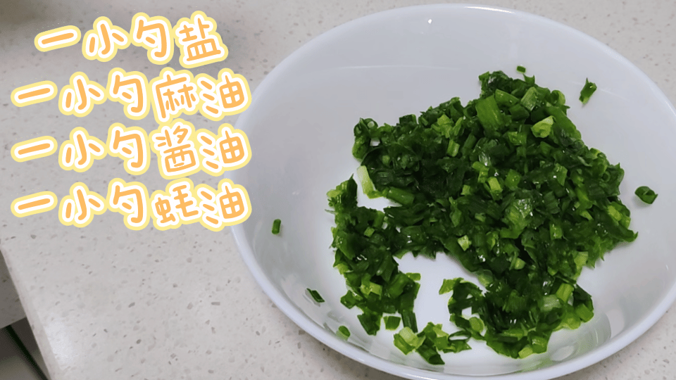 3、将葱末、1/2小勺盐、芝麻油、生抽、蚝油一同放入碗中,搅拌均匀。