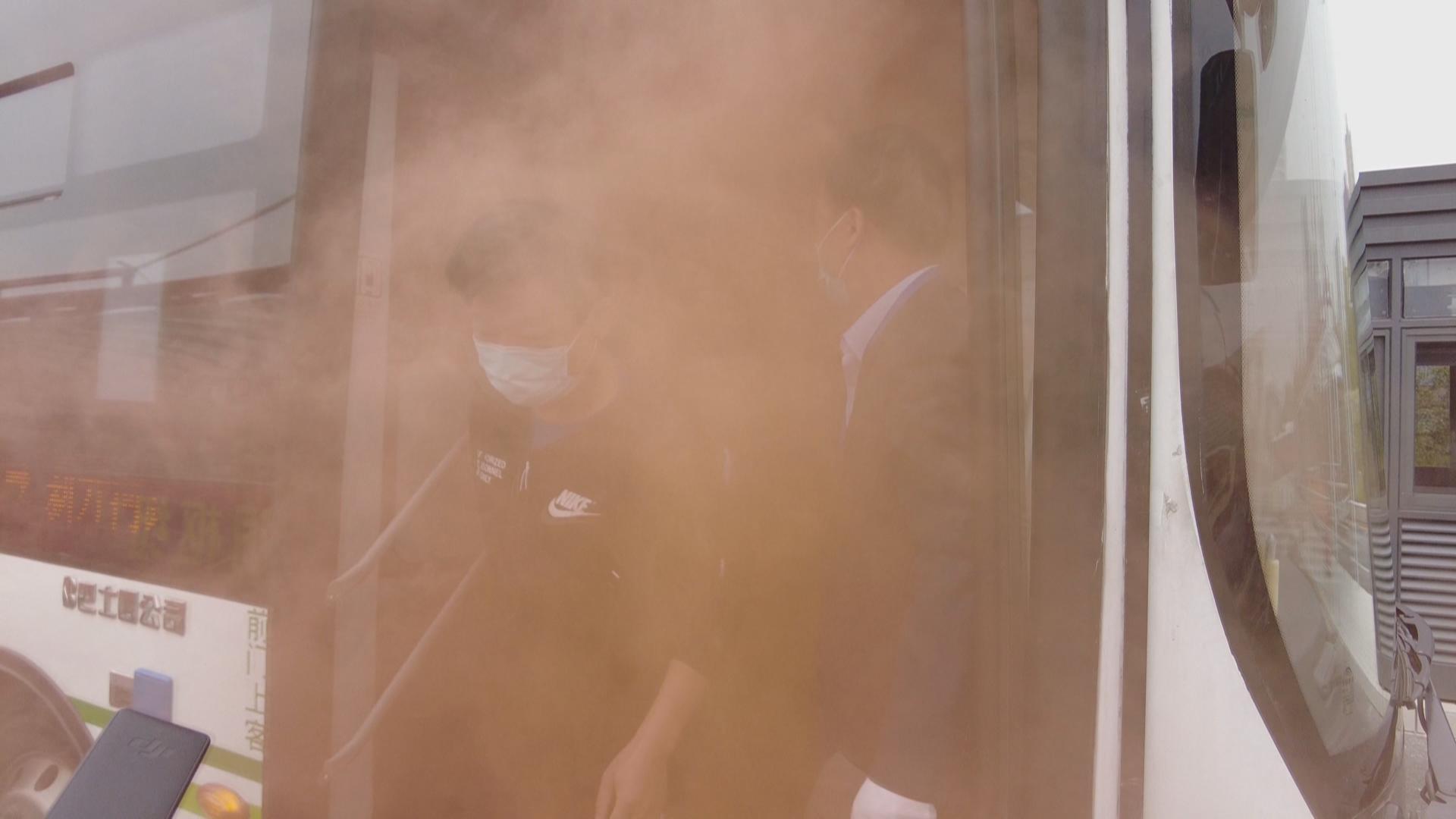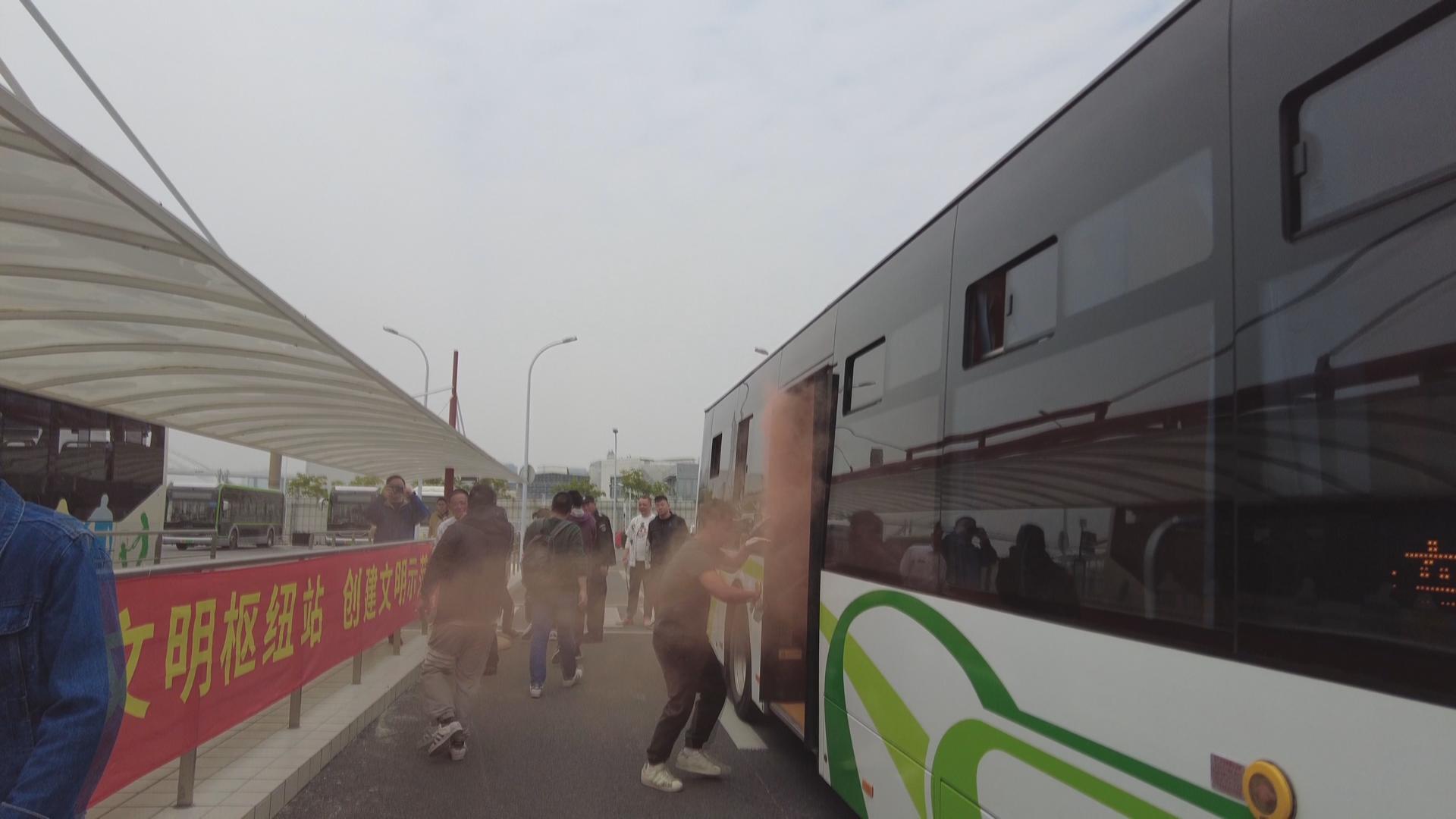 “有序疏散,前门后门都可以。”演习现场,只见一辆刚刚驶入终点站的911路公交车上突然冒出了一股浓烟,驾驶员老钱立刻将车辆靠边、打开车门、熄火、拔掉车钥匙,组织车上乘客疏散,几个步骤一气呵成,疏散过程中,老钱还不断地提醒大家要注意安全,有序下车。待乘客全部疏散后,老钱最后将车辆的电门关闭,让车辆处于断电的状态,老钱介绍,因为公交车是新能源车,电门在车厢尾部,关掉后就相当于切断了电源,可以避免事故进一步扩大。而此时,枢纽站内的安保人员也早早察觉到了异常,在乘客疏散完毕后带着灭火器上车灭火。