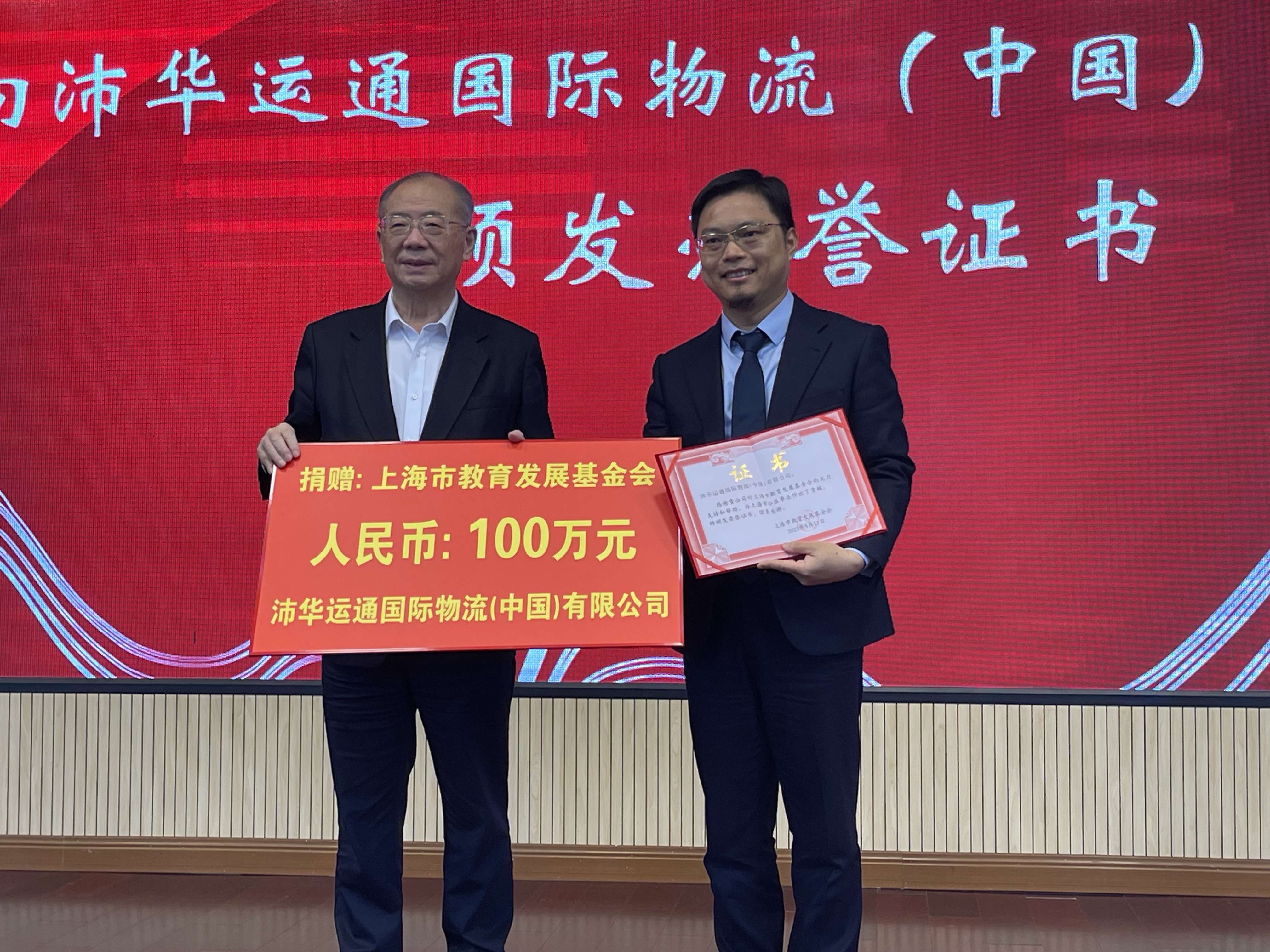 仪式上,沛华运通公司首席运营官陈黄煌先生代表公司向上海市教育发展基金会捐赠一百万元人民币善款,上海市教育发展基金会理事长王荣华代表基金会向沛华运通公司颁发荣誉证书。
