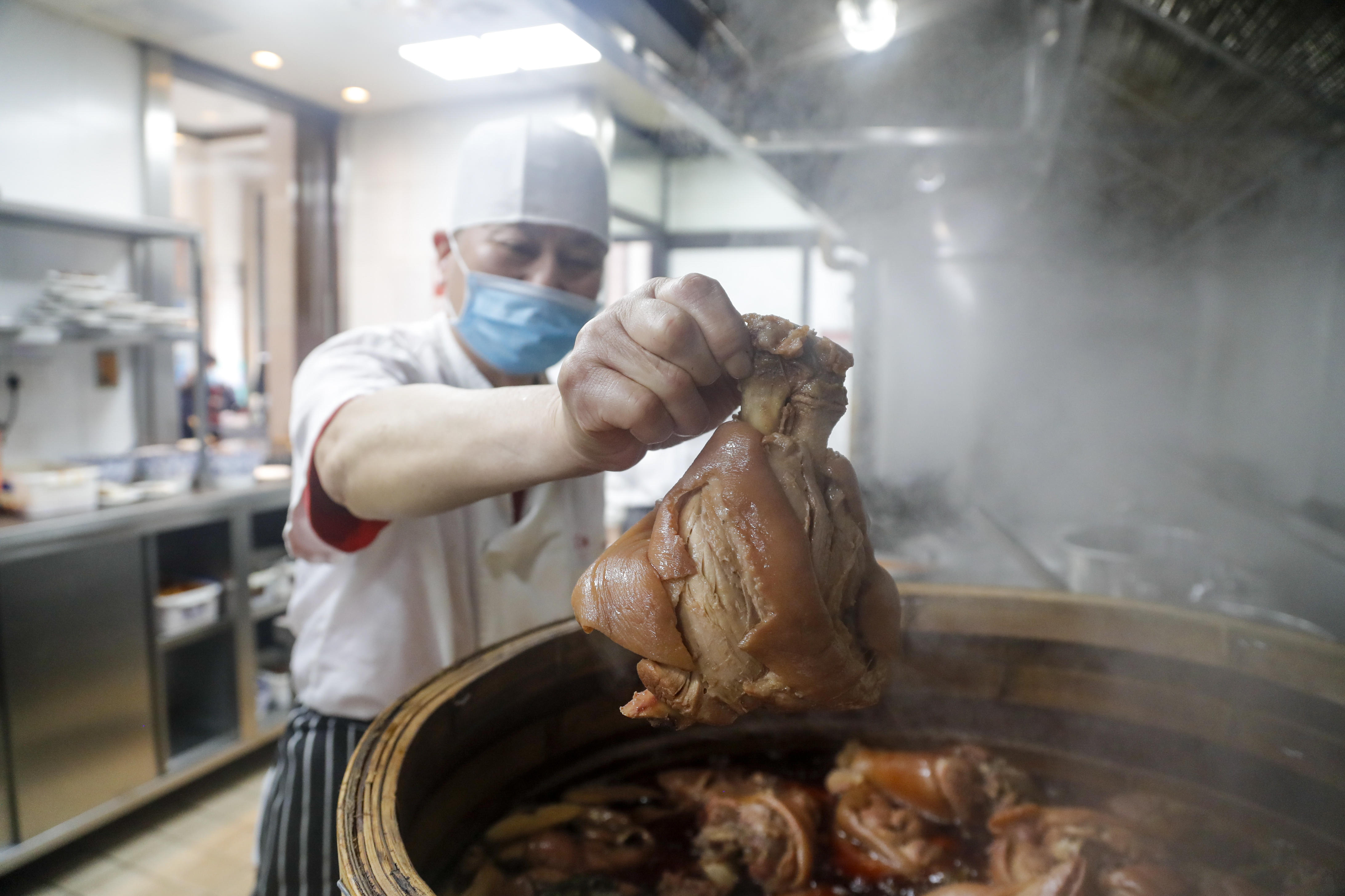 在他看来,这碗曾被誉为“上海第一面”的焖蹄面之所以“冠绝沪上”,原因有三:首先是原料,只精选2.5—3斤的前蹄,由专做蹄髈的老师傅亲手挑出,不合格的直接退货;其次是流程,严格执行各道工序,配料更是祖传秘方;最后放在特制的竹编蒸笼里,炖足4个小时才能出锅。