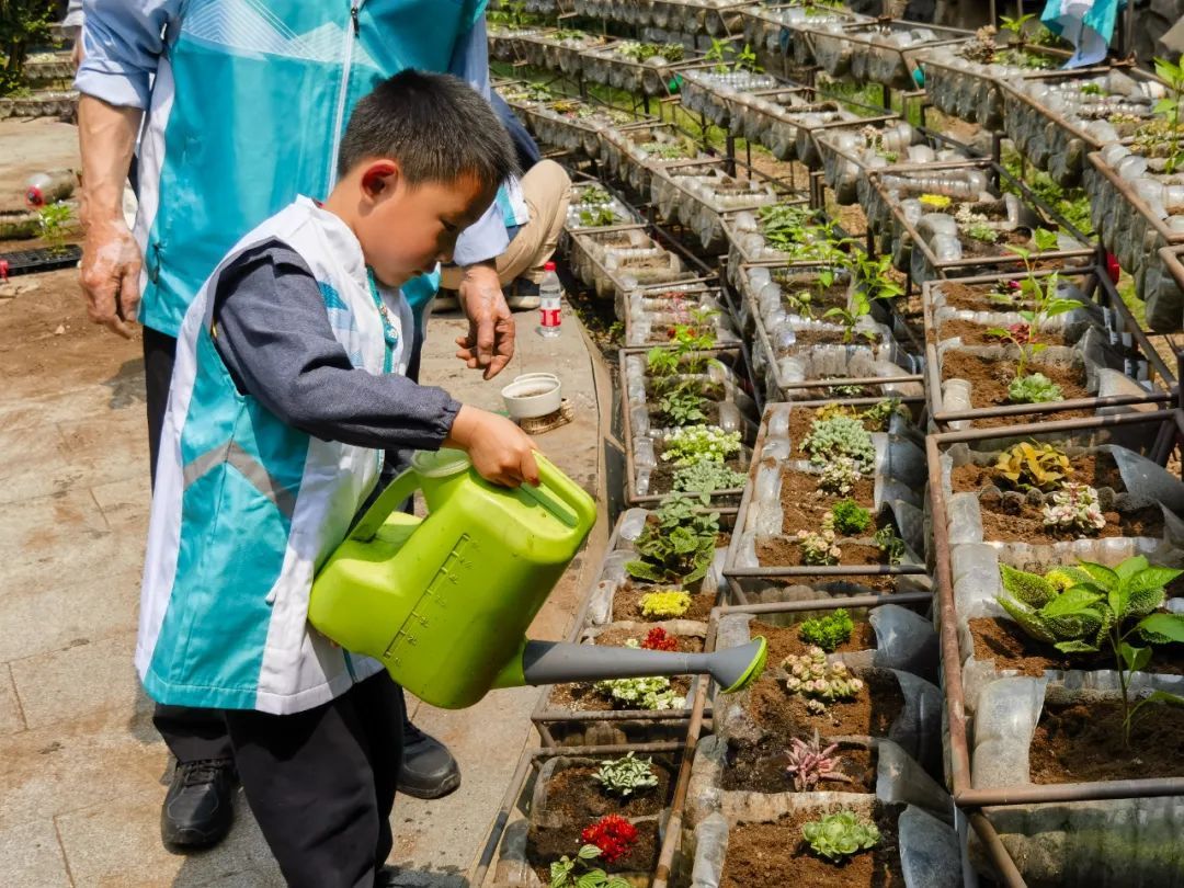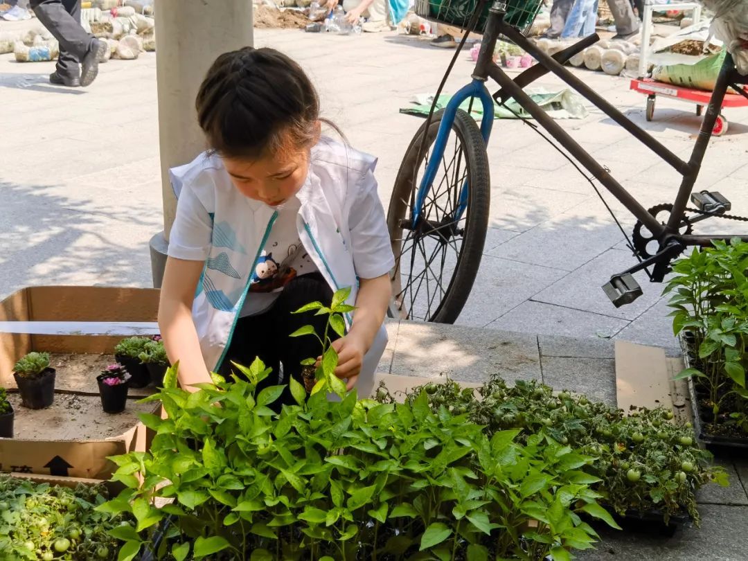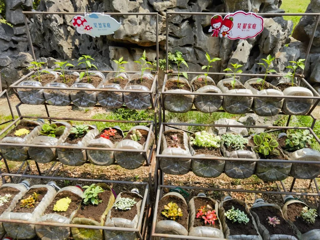 早上,十余名小朋友在家长的陪伴下抓阄认领了“责任田”后,来到小区小花园一侧的“亲瓶菜园”,认真打理自己负责的塑料瓶花盆。待换盆、松土完成后,孩子们精心挑选了番茄、辣椒苗和各种多肉植物,将其种进盆里并培土、浇水,很快,就让原本略显荒芜的立体菜园恢复了多彩生机。