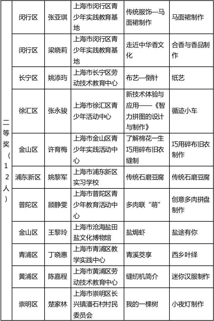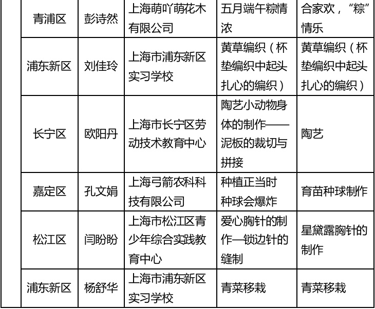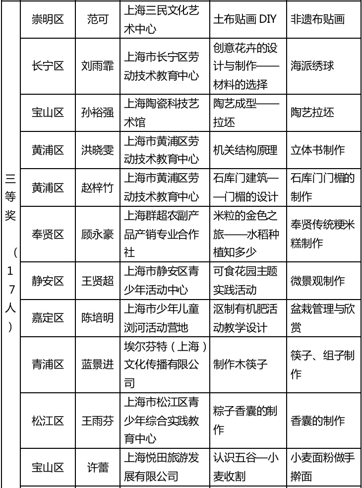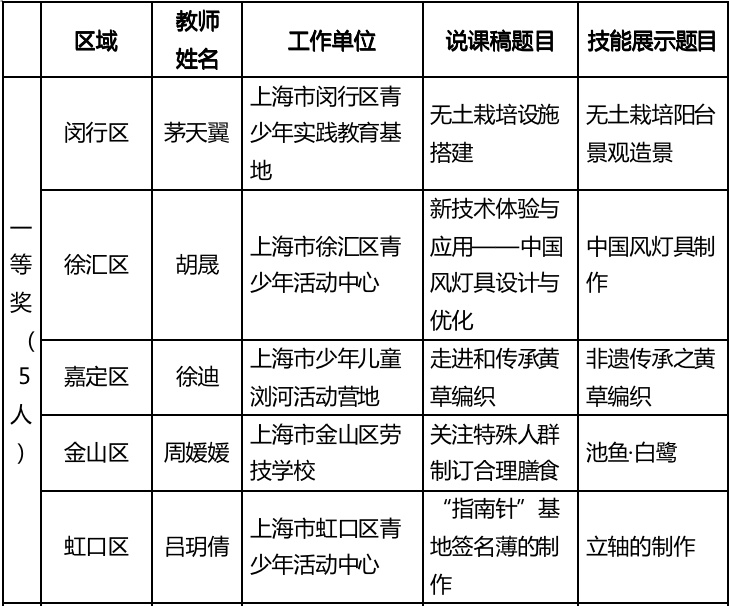 上海市劳动教育基地教师教学技能展示竞赛获奖名单