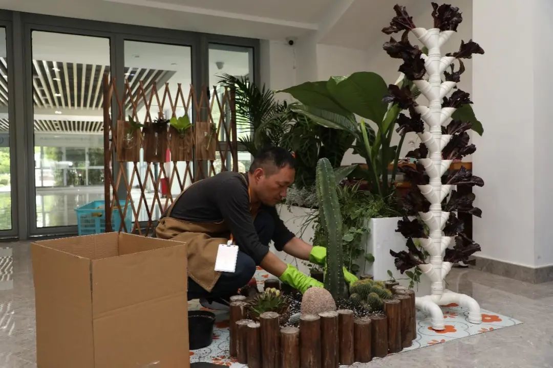 闵行区青少年实践教育基地教师茅天翼演示如何在阳台上进行无土栽培景观造景