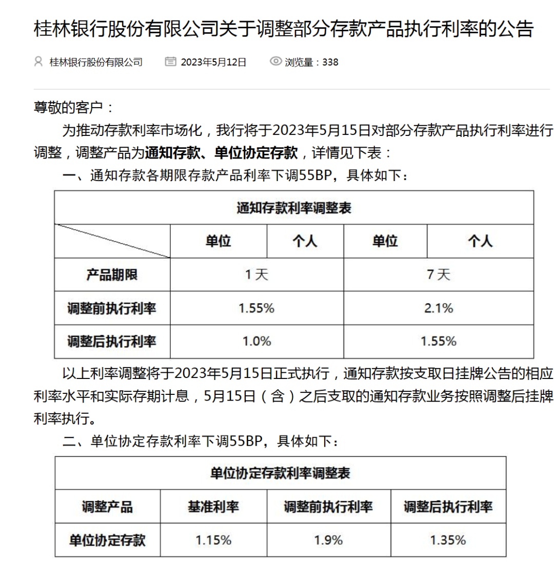 桂林银行也发布公告称,为推动存款利率市场化,将于5月15日对部分存款产品执行利率进行调整,调整产品为通知存款、单位协定存款。