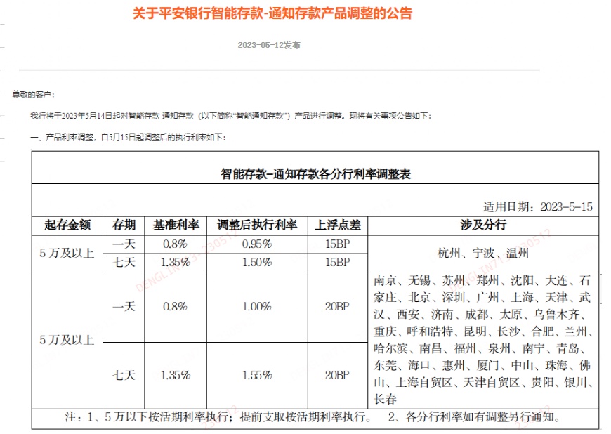 广州、深圳、北京、上海等分行5万及以上起存金额1天和7天期通知存款利率调整为1%、1.55%,均较基准利率上浮20bp;杭州、宁波、温州分行5万及以上起存金额1天和7天期通知存款利率调整为0.95%、1.5%,均较基准利率上浮15bp。