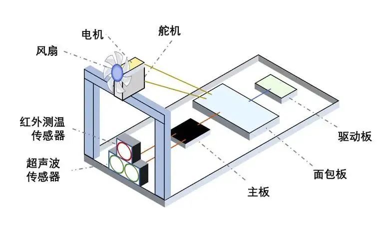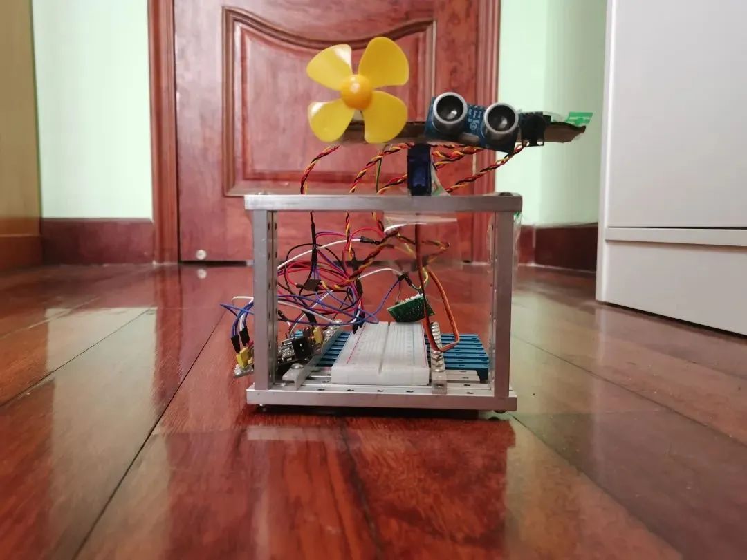 在多次讨论及测试之后,项目组成员决定基于Arduino硬件开发平台,应用单片机、舵机、超声波测距传感器、红外测温传感器等多种基本元器件,设计并制作一款同时具备自动旋转、智能锁定、风速调整功能的智能风扇,从而使风扇寻找到目标后再锁定吹风,避免了常规的“摇头”功能带来的能源损失。