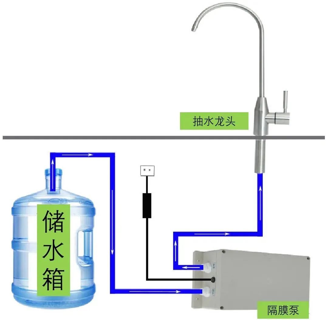通过隔膜泵和水龙头来实现抽水再利用功能。隔膜泵是一个微型真空泵,内部的机械装置使得内部隔膜做往复运动,在进口处形成负压,出口处形成正压,让水流从进口流向出口。出口水管连着水龙头,龙头一开,隔膜泵自行启动。龙头关闭了泵就停止工作。以16瓦隔膜泵为例,出水量能达到2.7升/分钟。抽完30升水箱,隔膜泵耗电量为3瓦时,一年耗电量仅1.1度,但一年节约用水量却有11吨!