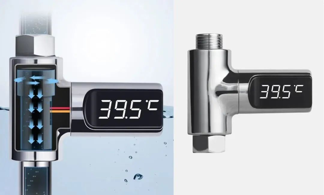 在通往储水箱的水管上安装一个水流及水温指示器。它全身防水,也不需要电源,利用电磁感应原理,靠水流推动叶轮把动能转化为电能。里面的热敏电阻传感器,可精确到0.5摄氏度。当水流过时,面板上即可显示当前水温;如果数字熄灭了,说明储水箱已满。淋浴的人看着这个指示器,就知道要不要切换到花洒出水。