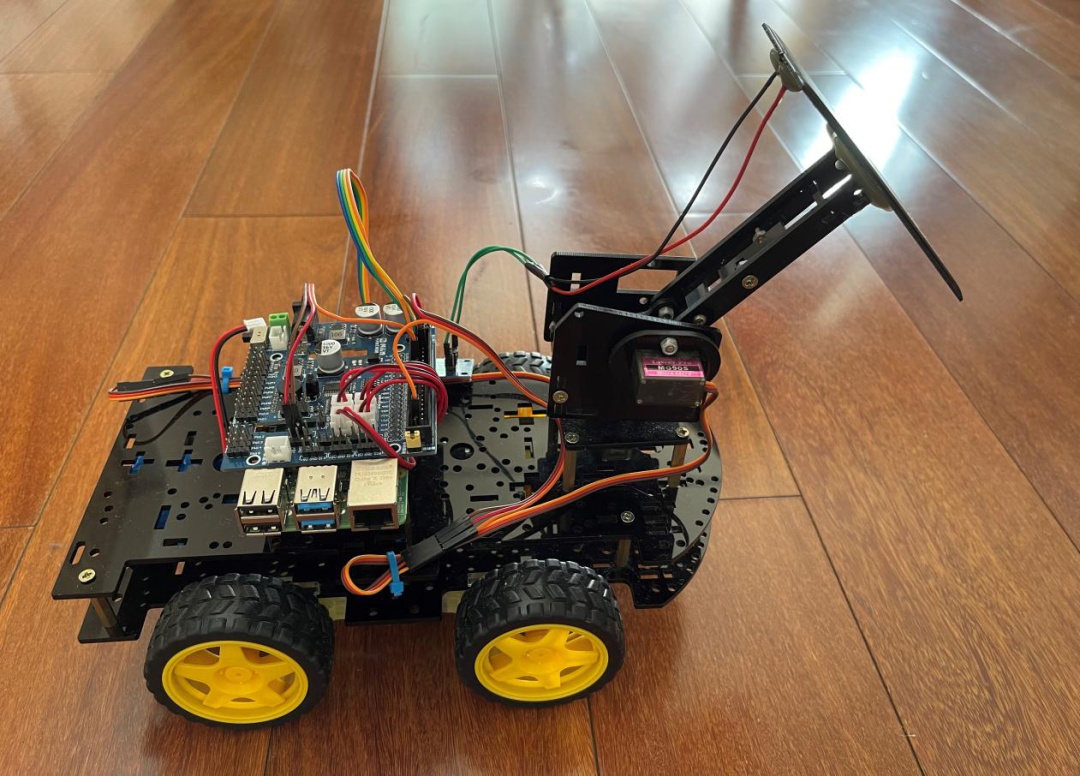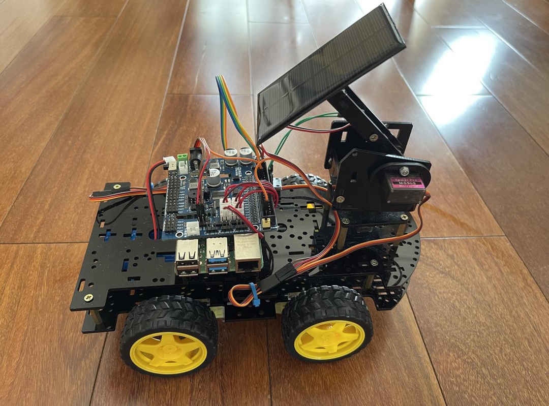 本项目首先将配件组装成四轮驱动的小车,加装太阳能板为小车提供能量,小车由太阳能提供能量通过人工控制可自由前进、倒退、转向,将树莓派主板装至小车顶部,机械臂控制太阳能电池板,机械臂由电线连接扩展板再接至树莓派主板。