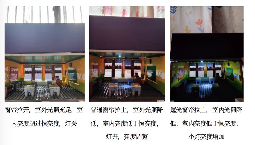 在教室模型天花板上安装光敏电阻,用拉开/拉上窗帘模拟室外光线变化,经过系统仿真与调试,智能感光的照明亮度自动调节也得到实现。