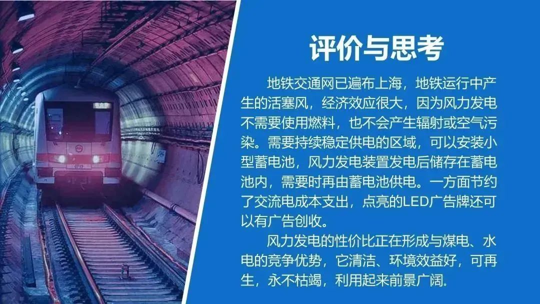 地铁交通网已遍布上海,利用地铁运行中产生的活塞风进行发电,前景广阔。既可以减少辐射和空气污染,达到碳减排的目的,也可以增强经济效应。需要持续稳定供电的区域,可以安装小型蓄电池,风力发电装置发电后储存在蓄电池内,需要时再由蓄电池供电。